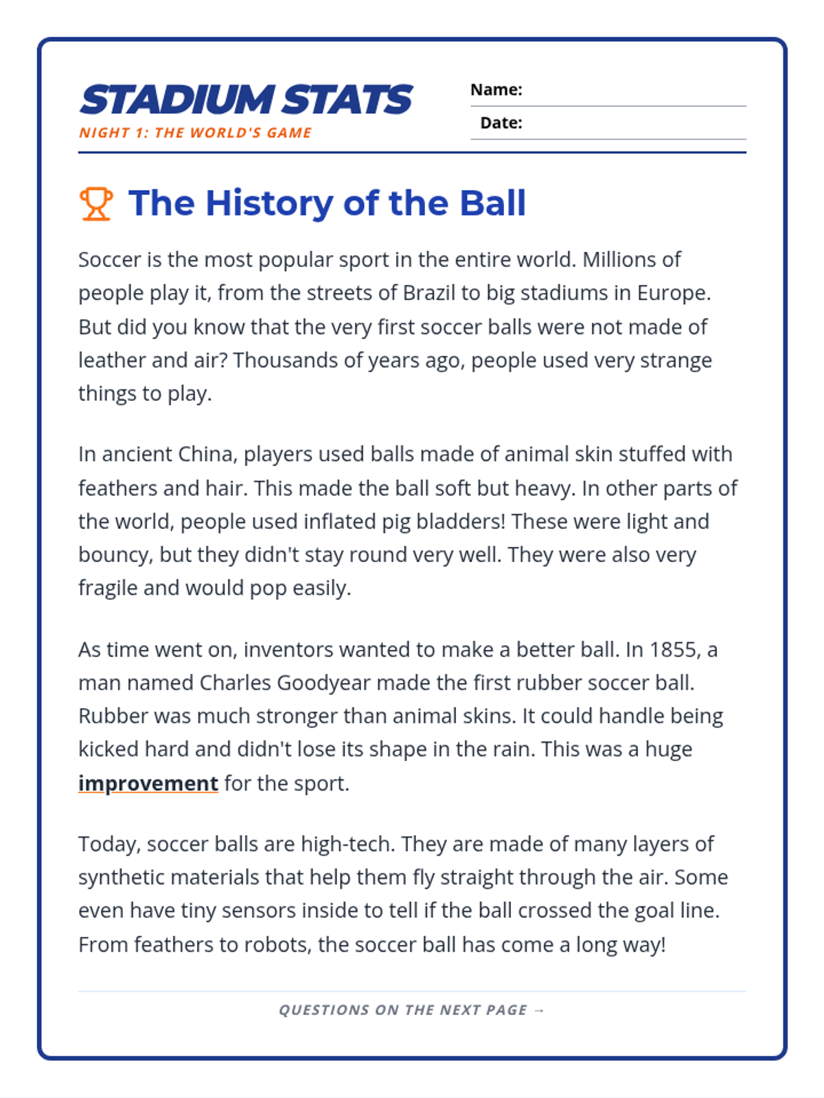 Day 1 of the homework packet focusing on the history of the soccer ball. Includes a 4-paragraph passage and 7 comprehension questions. Revised for better page layout and larger work areas.