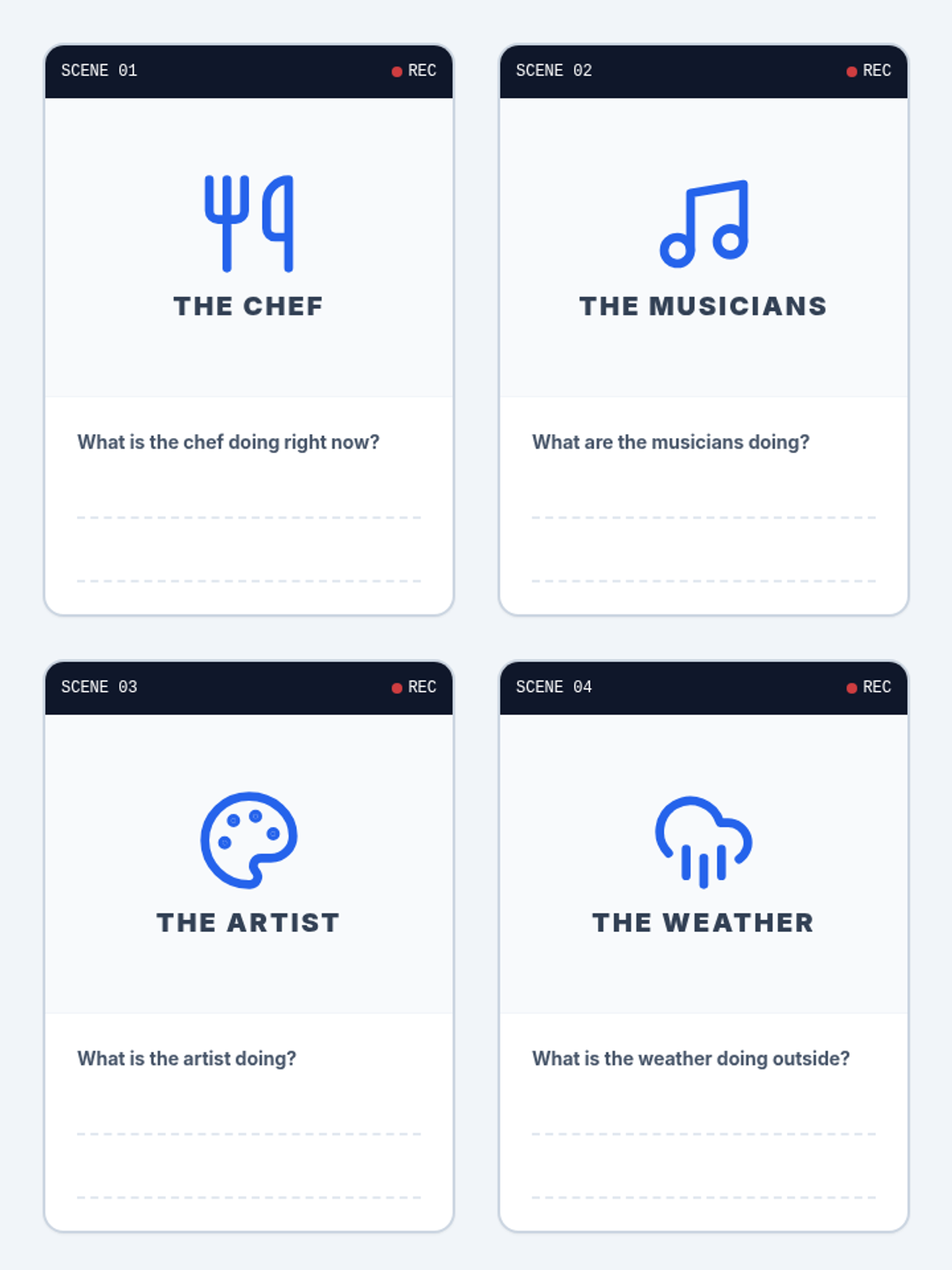 A set of 8 themed task cards for small group practice, featuring icons as visual prompts for students to generate present progressive sentences.