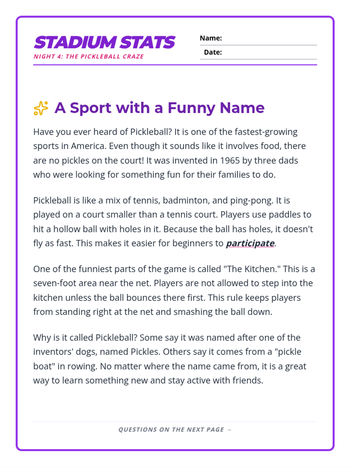 Day 4 of the homework packet introducing Pickleball. Features a 4-paragraph passage and 7 comprehension questions. Revised for better page layout and larger work areas.