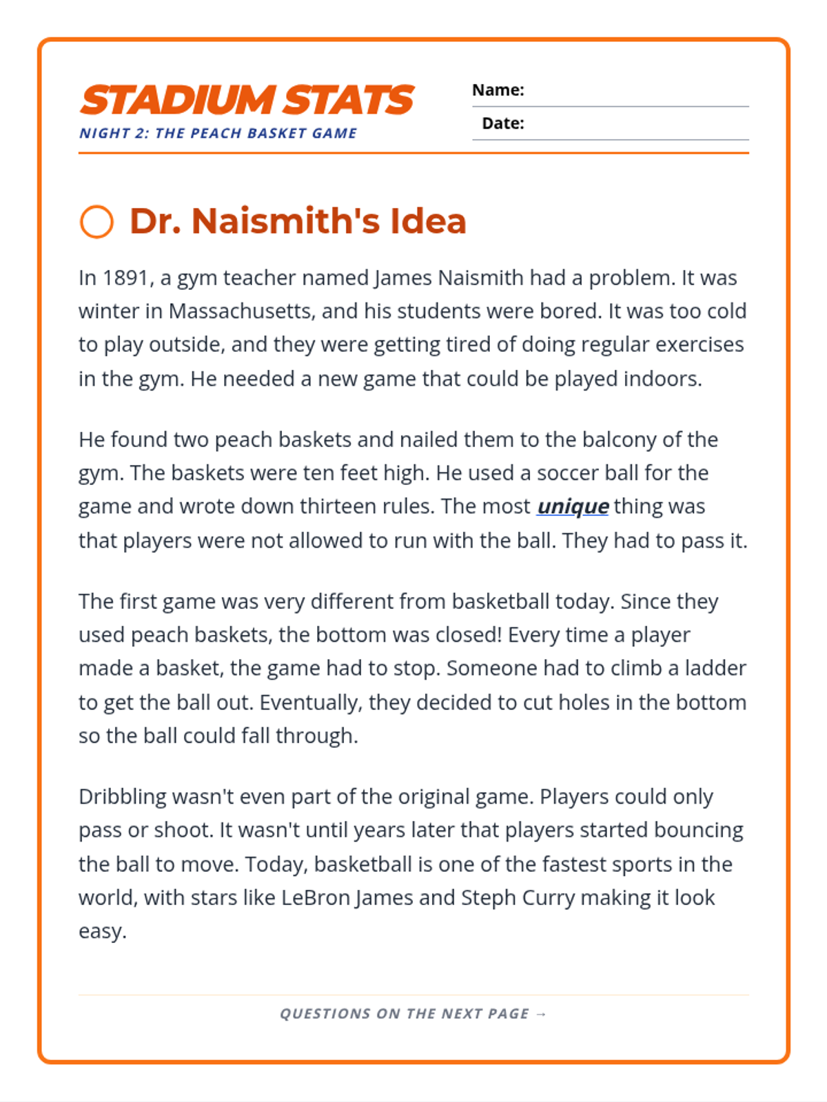 Day 2 of the homework packet covering the invention of basketball. Features a 4-paragraph passage and 7 comprehension questions. Revised for better page layout and larger work areas.