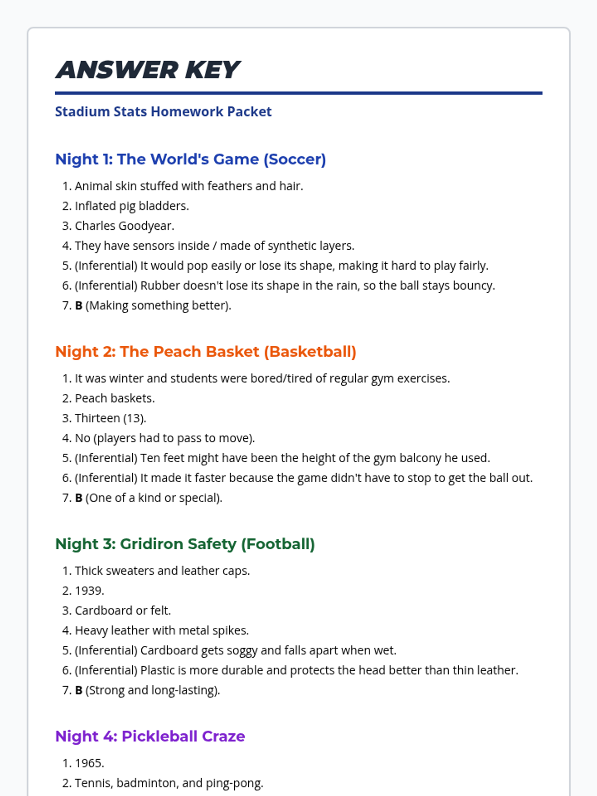 Teacher's answer key for the 5-day Stadium Stats reading packet. Includes answers for all literal, inferential, and vocabulary questions.
