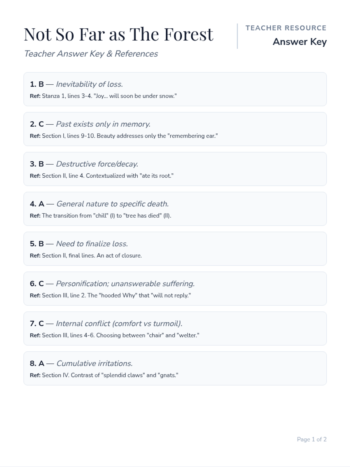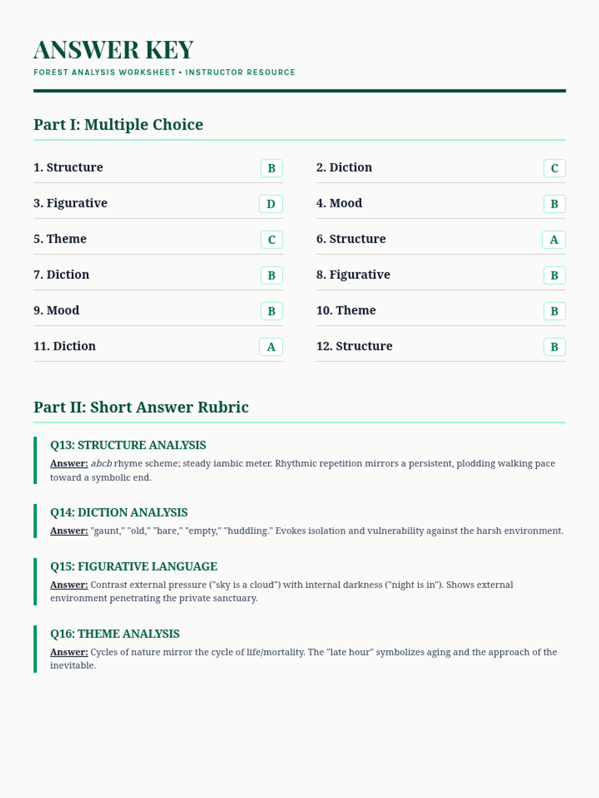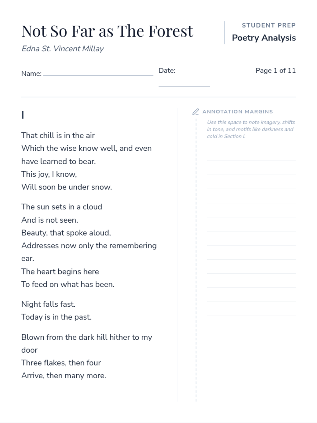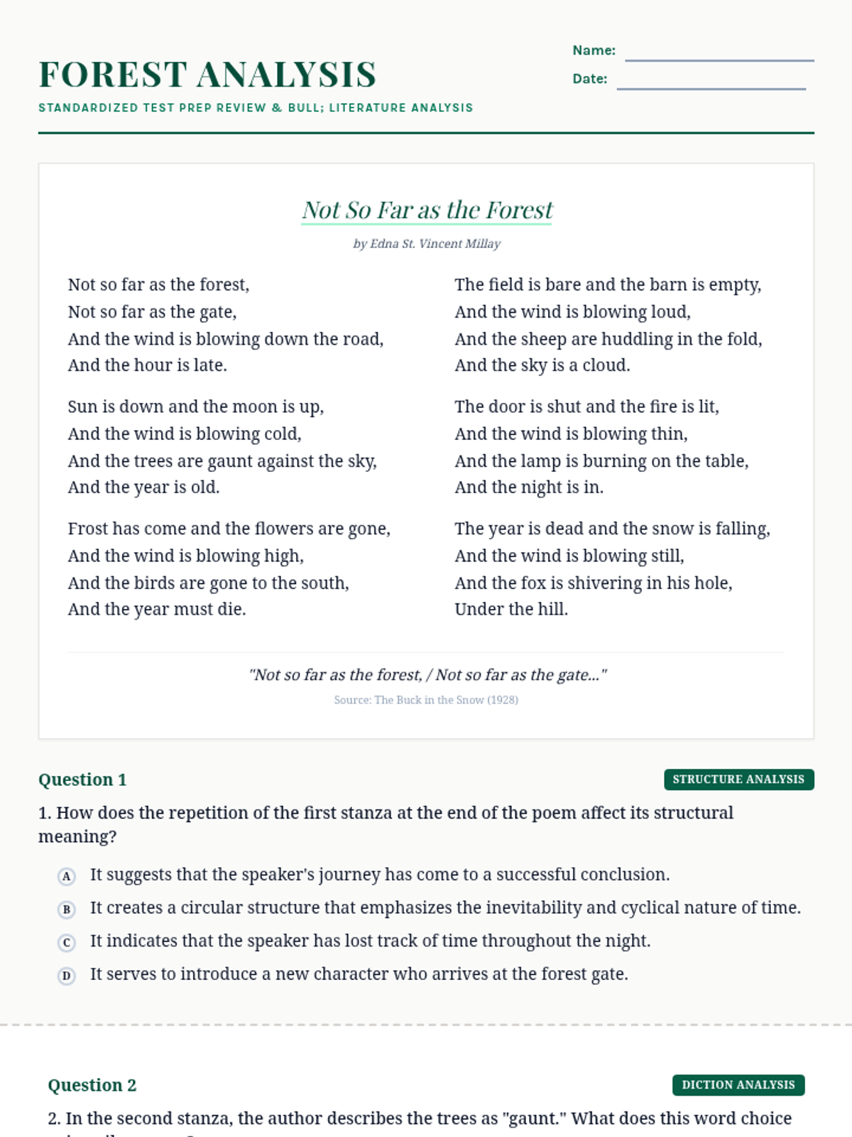 A six-page comprehensive review worksheet based on Edna St. Vincent Millay's poem 'Not So Far as the Forest'. It includes the poem text, 12 multiple-choice questions, and 4 short-answer questions focused on structural analysis, diction, figurative language, mood, and theme.
