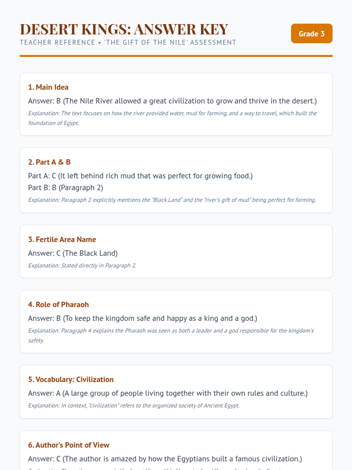 Answer key for the Desert Kings comprehension assessment. Includes point-by-point explanations and a short-response rubric for teachers. Revised for clarity and answer label consistency.