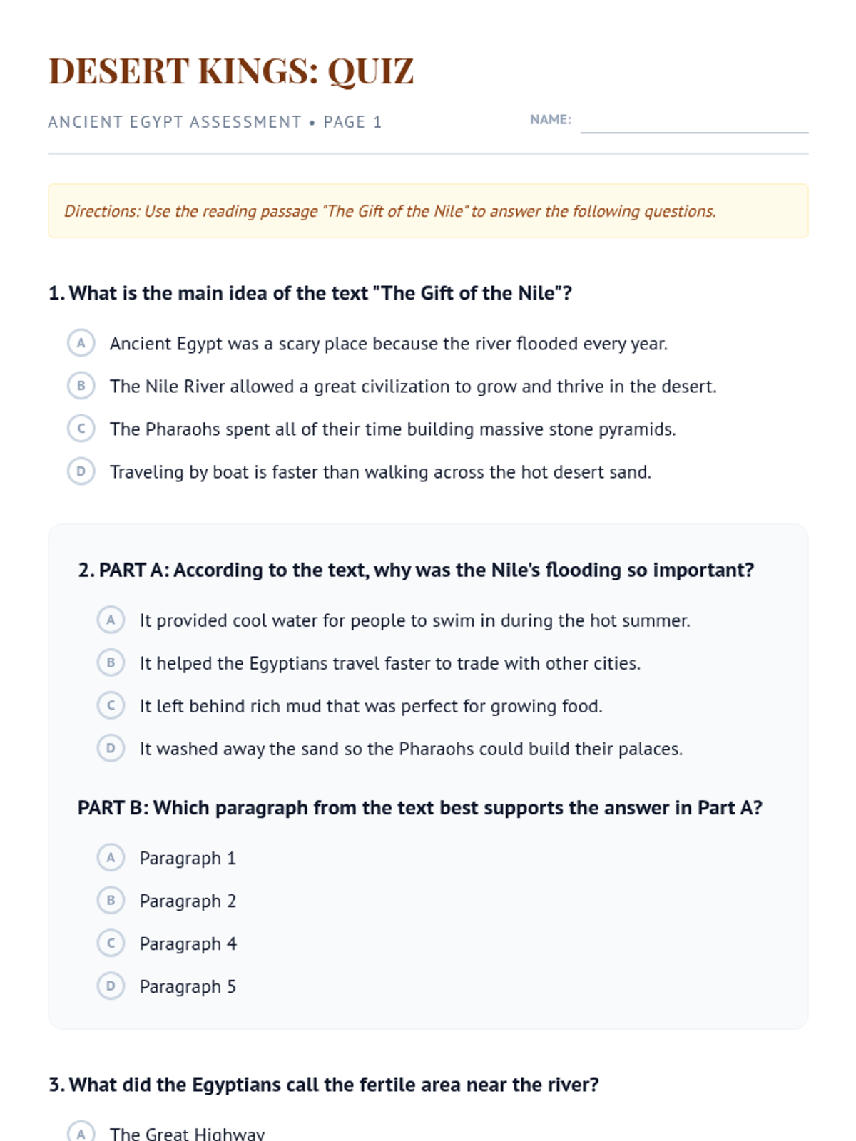 Part 1 of the comprehension assessment for 'The Gift of the Nile'. Includes multiple choice and part A/B evidence questions focusing on main idea and key details. Revised with labels and improved page break protection.