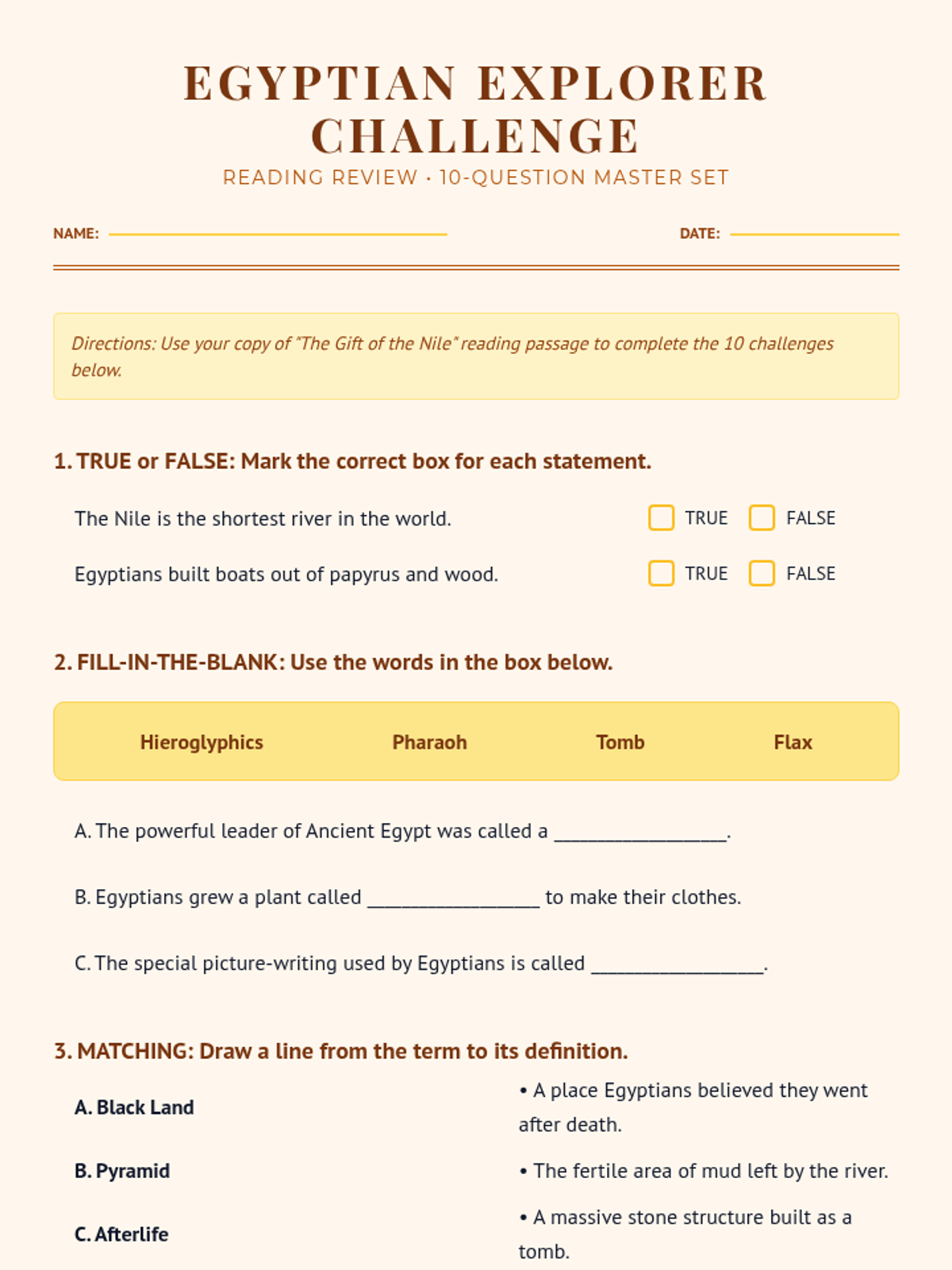 A comprehensive 10-question review worksheet for 'The Gift of the Nile'. Features 10 different question styles including true/false, fill-in-the-blank, matching, sequencing, and an illustration task. Designed for Grade 3. Revised with darker lines and improved alignment.