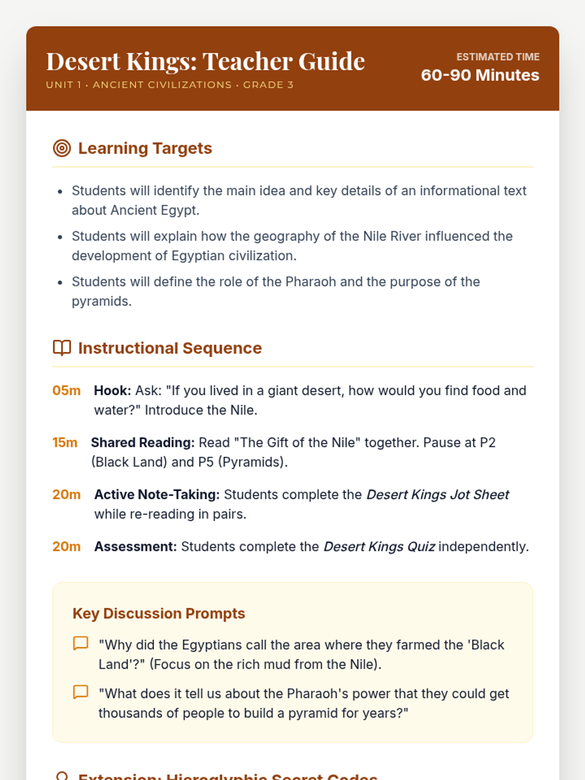 A comprehensive Teacher Guide for the Desert Kings lesson, including learning targets, discussion prompts, instructional sequence, and an extension activity focusing on hieroglyphics. Revised with improved layout and page break protection.