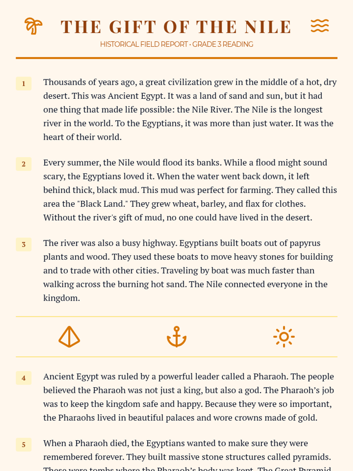 A 3rd-grade level informational text about Ancient Egypt, focusing on the Nile River, agriculture, Pharaohs, and pyramids. Paragraphs are numbered for easy reference during assessment. Revised with improved page break protection and header layout.