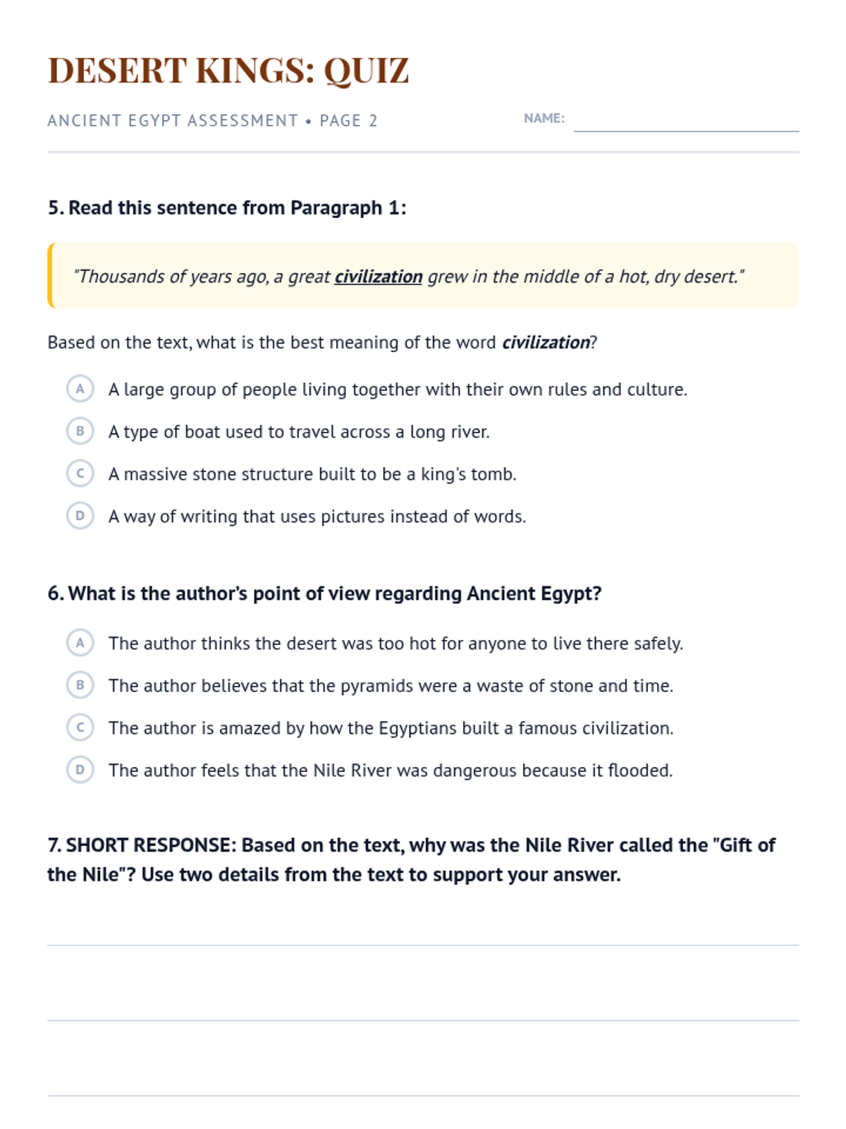 Part 2 of the comprehension assessment for 'The Gift of the Nile'. Includes vocabulary, author's point of view, and a short-response question with ample writing space. Revised with labels and improved layout.