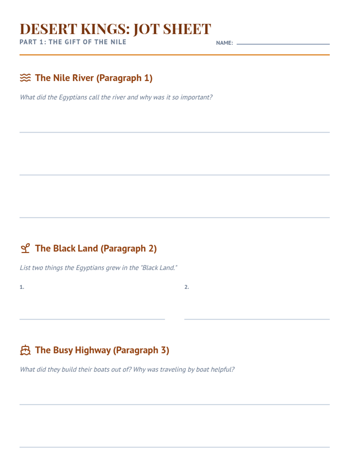 A two-page note-taking graphic organizer (jot sheet) for the Desert Kings lesson. Page 1 focuses on the Nile and farming; Page 2 focuses on Pharaohs and pyramids. Features large handwriting lines for Grade 3. Revised with increased spacing and improved layout.