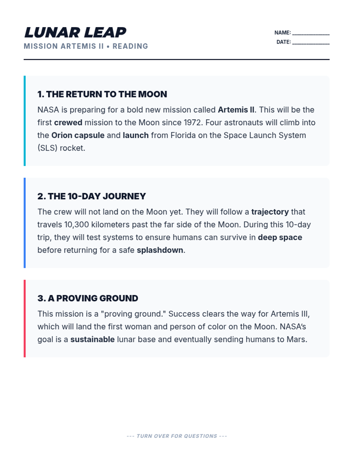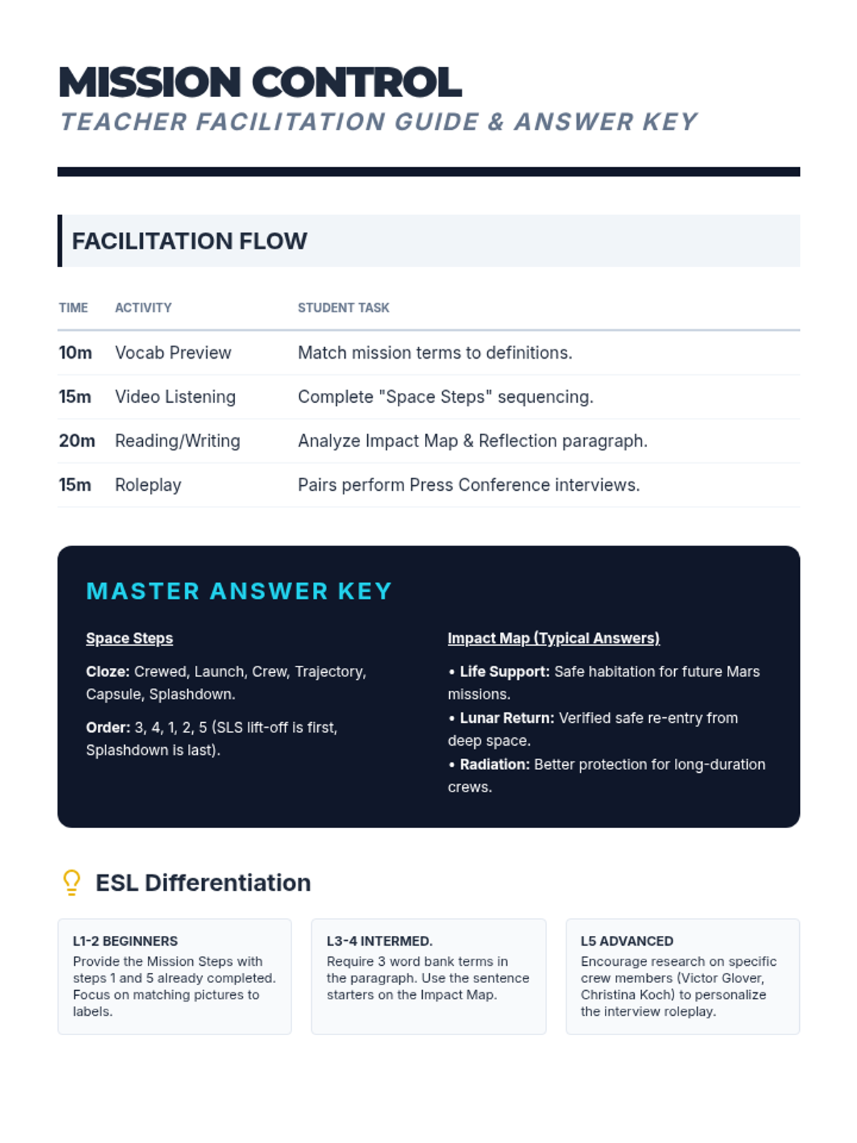 A teacher-facing guide providing lesson pacing, answer keys, and specific ESL differentiation strategies for the Artemis II lesson.