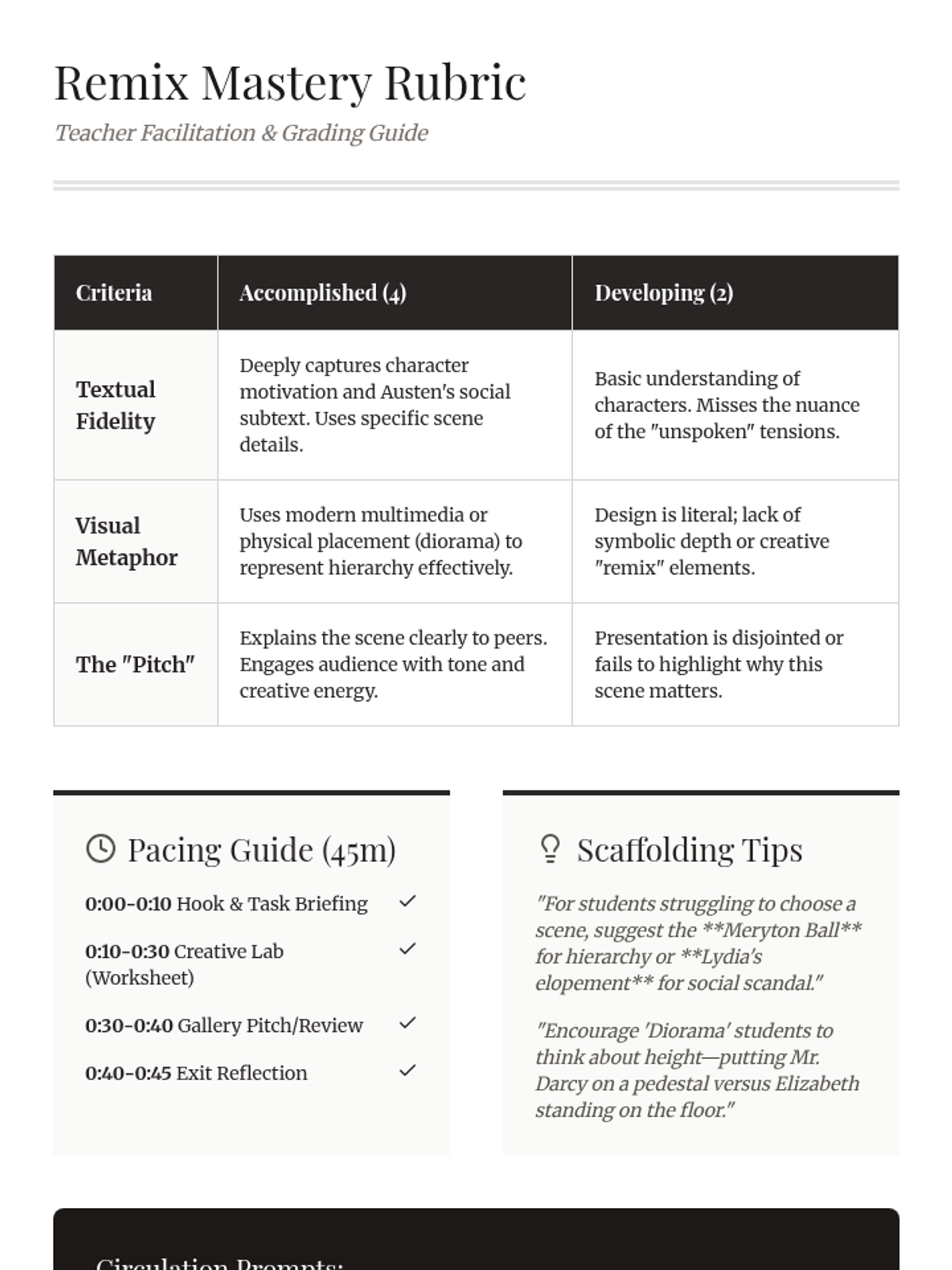 A teacher's guide and rubric for the Regency Remix lesson. It includes a grading scale based on textual fidelity and visual metaphor, a 45-minute pacing guide, and scaffolding prompts for circulation.