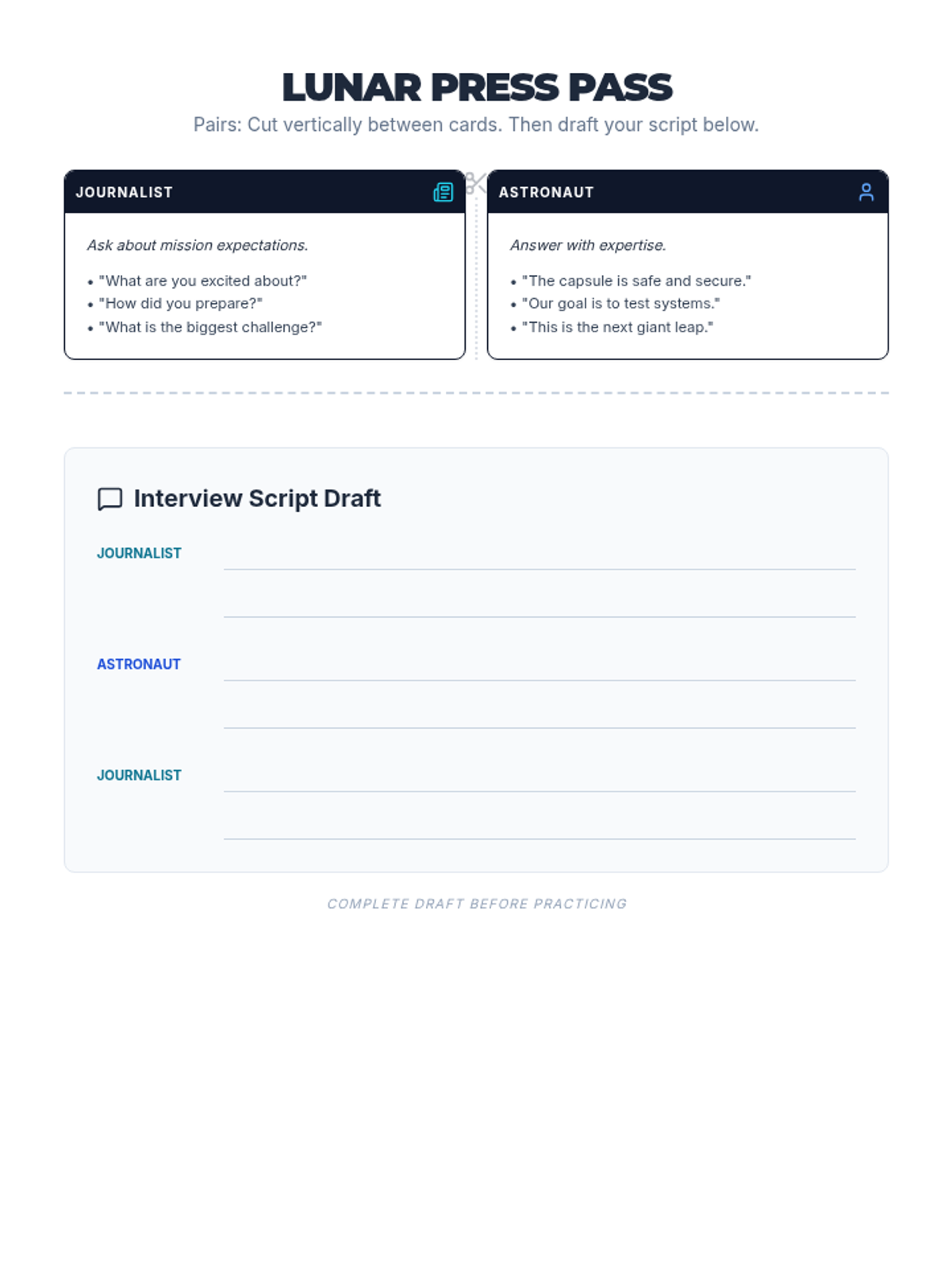 Speaking activity roleplay cards and script draft area, optimized for single-page 8.5x11 printing.