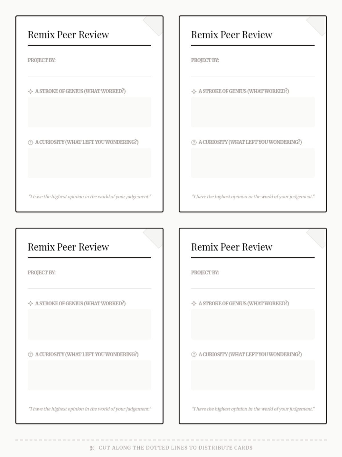 Small feedback cards for students to use during the project gallery walk. Each card provides space for positive feedback and clarifying questions, framed with Regency-inspired quotes.