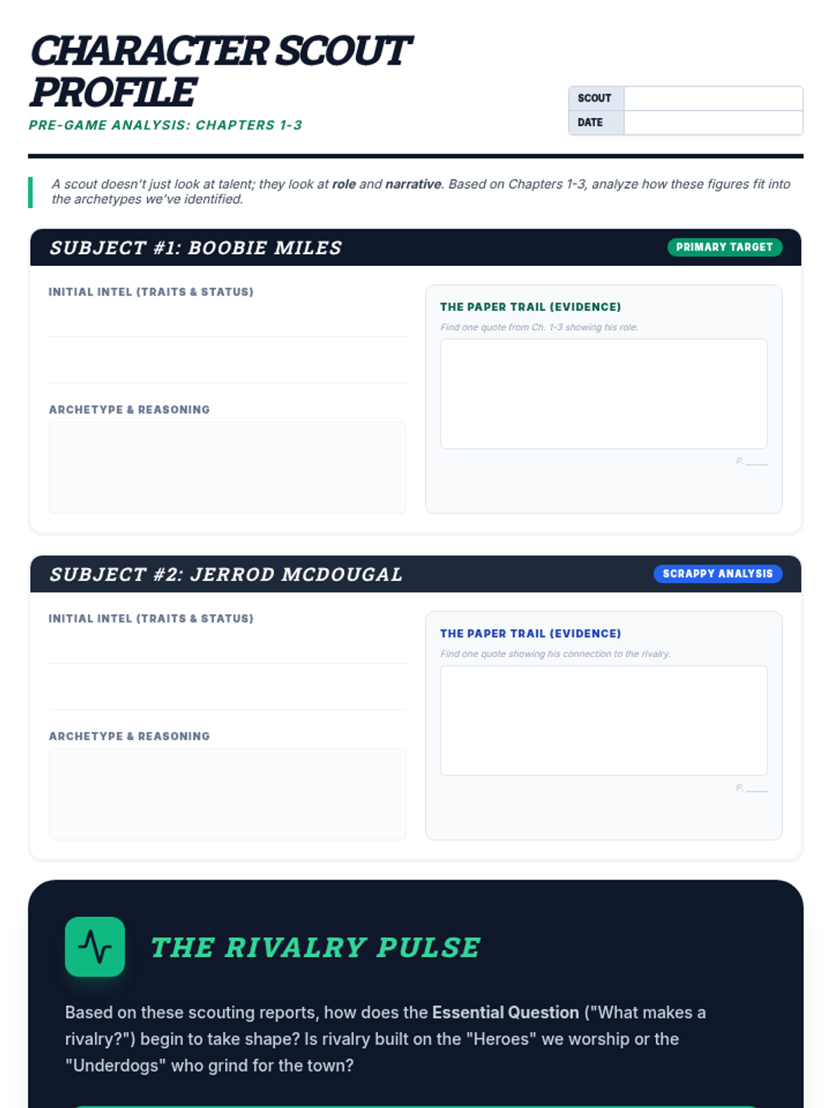 An initial character analysis worksheet for Lesson 1, where students apply archetypes to Boobie Miles and Jerrod McDougal based on the first three chapters of Friday Night Lights.