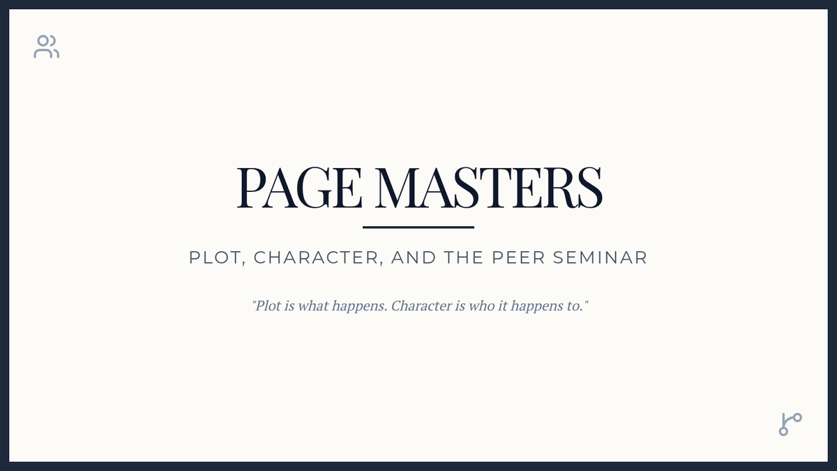 Visual presentation slides to introduce the "Page Masters" project. It outlines the 45-minute session breakdown focusing on plot and character development, specific novel anchors, and engagement tips.