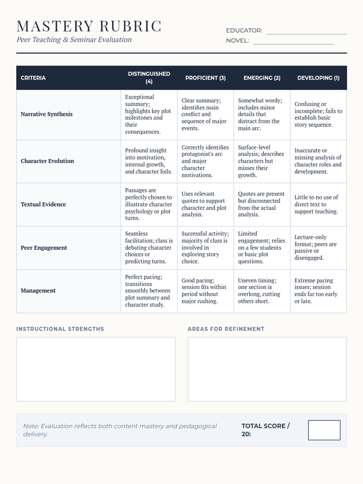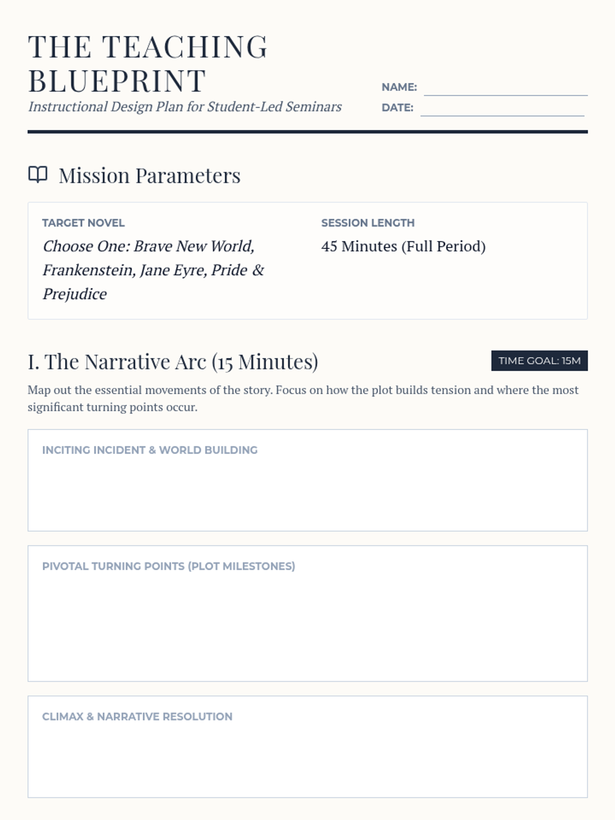 A comprehensive planning document for 12th-grade students to structure their 45-minute peer-teaching session. It includes sections for narrative arc mapping, character evolution analysis, and engagement strategies.