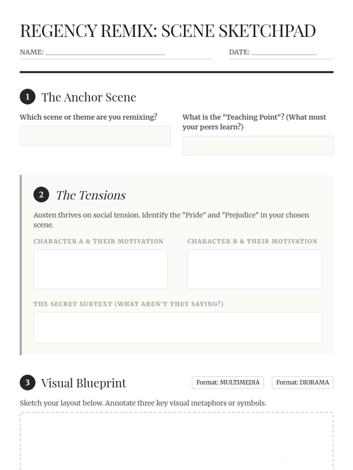 A planning worksheet for students to storyboard their Regency Remix projects. It guides them through selecting a scene, identifying character motivations, mapping out visual symbols, and drafting their project pitch.
