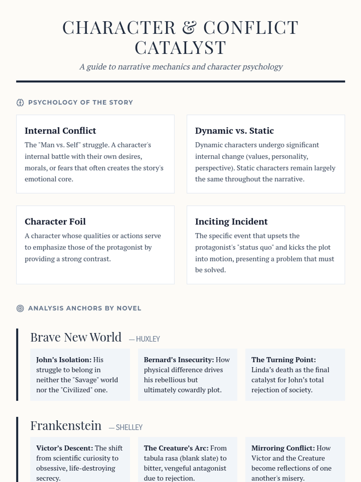 A reference sheet for students providing definitions of character and plot concepts and specific analysis anchors for the four selected novels. Ideal for supporting character-driven peer teaching.
