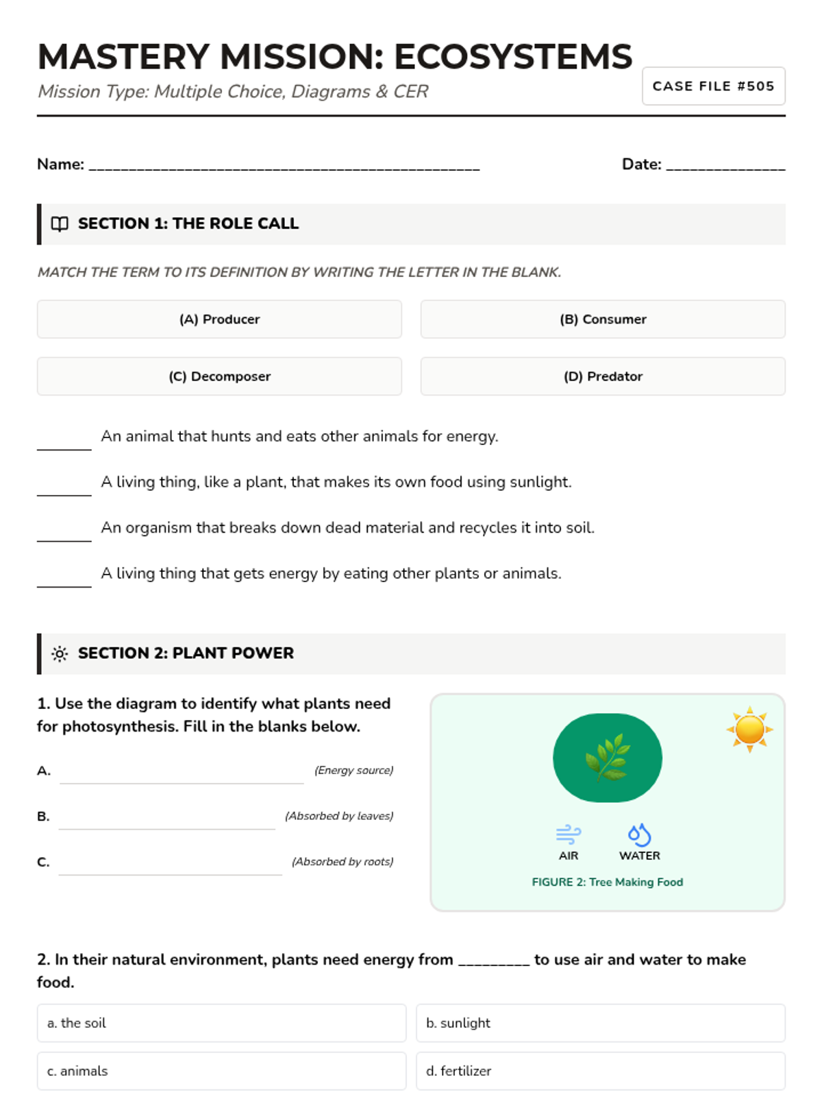 A comprehensive mastery mission worksheet featuring multiple choice questions, diagram labeling, fill-in-the-blank modeling, and a structured CER (Claim-Evidence-Reasoning) challenge. Students analyze plant needs, interpret data tables, and predict ecosystem changes.