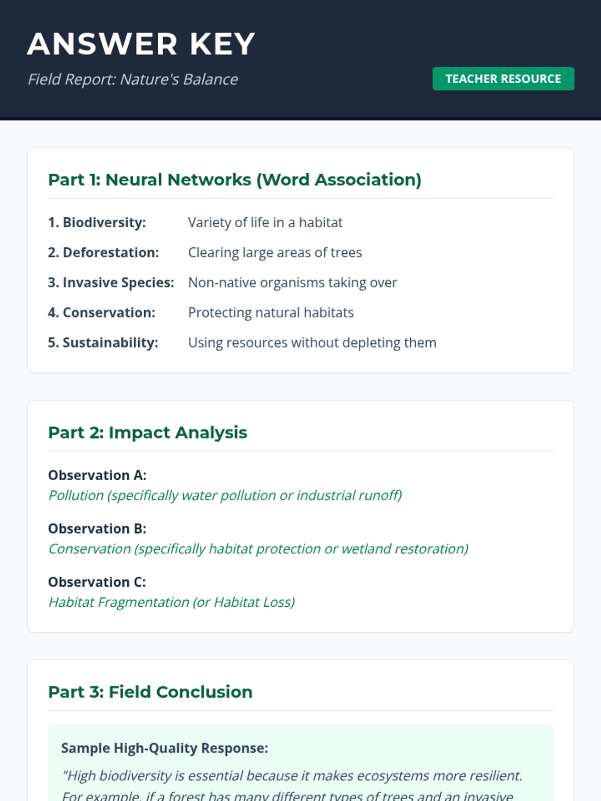 A comprehensive answer key for both the standard and support versions of the ecology worksheet. Includes sample high-quality responses for open-ended questions.