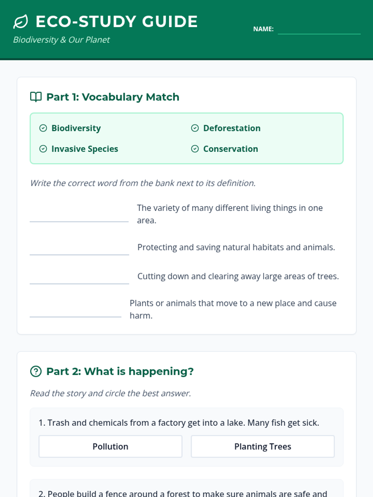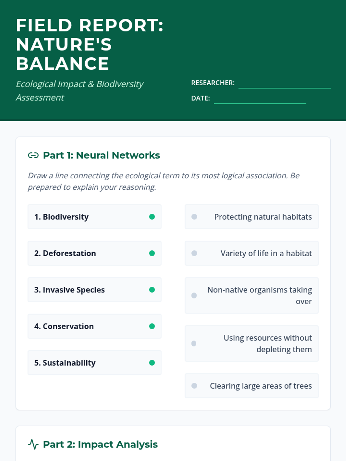 A vocabulary matching and scenario-based worksheet focusing on biodiversity, human impact, and conservation efforts. Includes word association and real-world impact analysis.