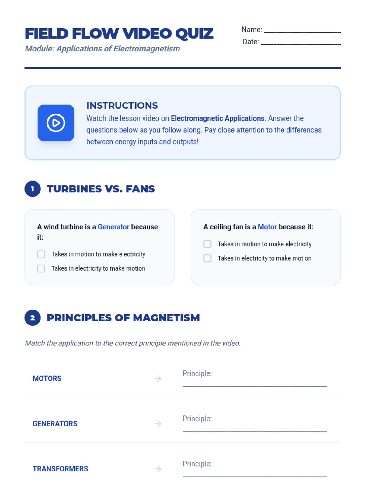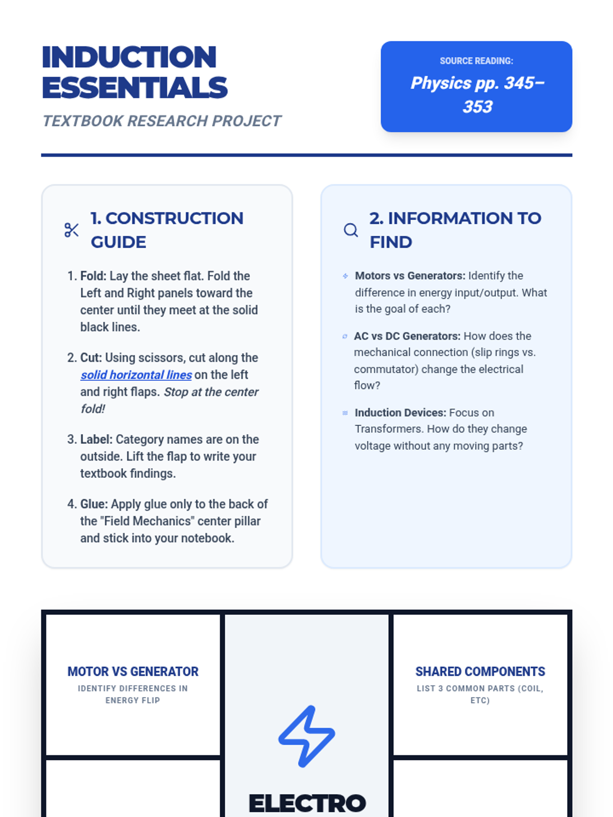 A hands-on foldable activity that scaffolds student research into motors, generators, and transformers using textbook pages 345-353. Includes construction instructions, a blank research template, and a performance rubric.