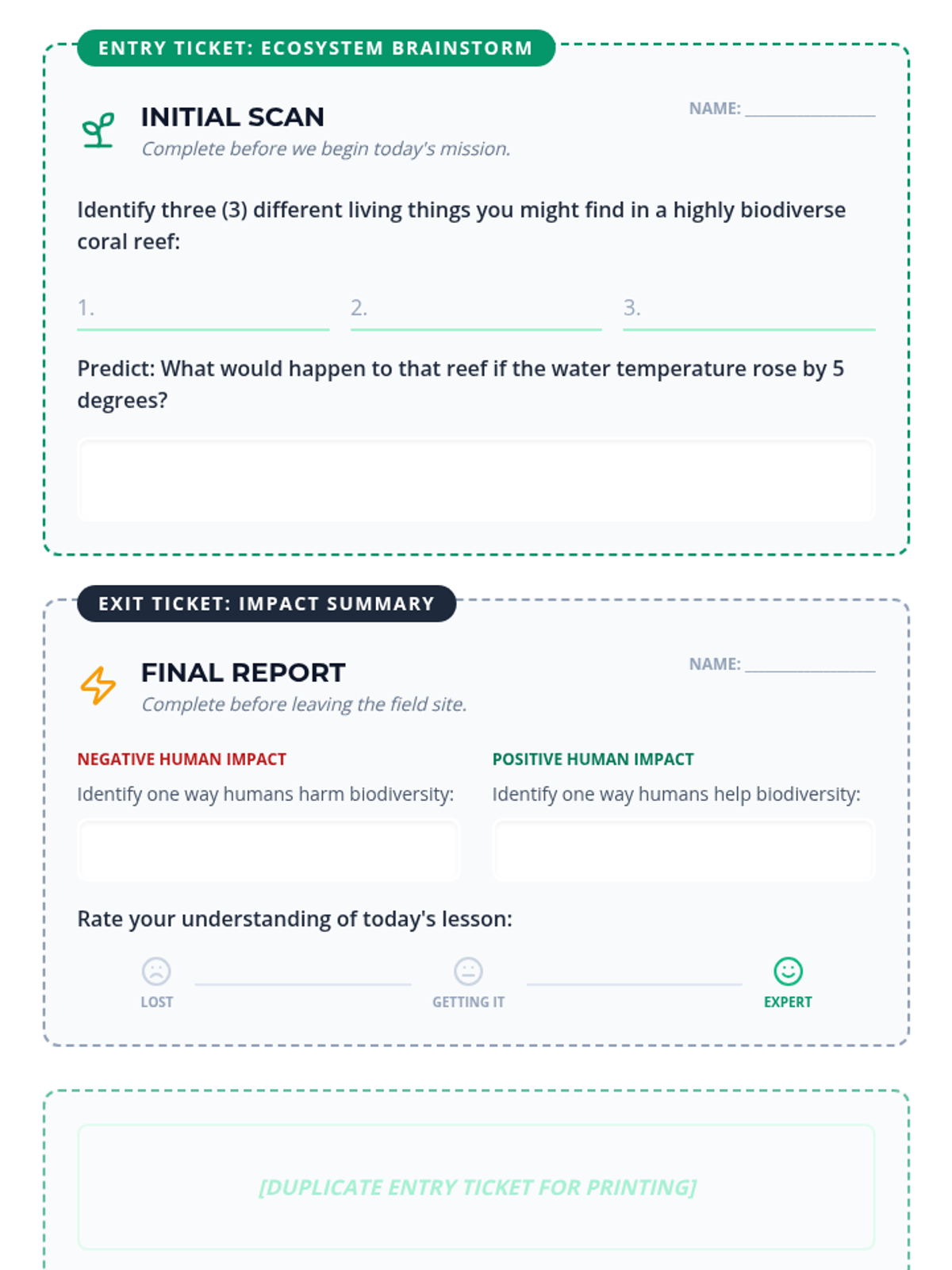 A page of printable entry and exit tickets focused on ecosystem biodiversity and human impact. Features quick brainstorms and self-assessment tools.