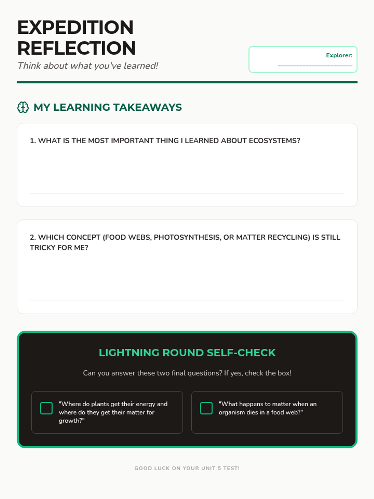An individual self-reflection and review sheet for the end of the study packet. Students track their learning takeaways and perform a lightning-round self-check to gauge assessment readiness.