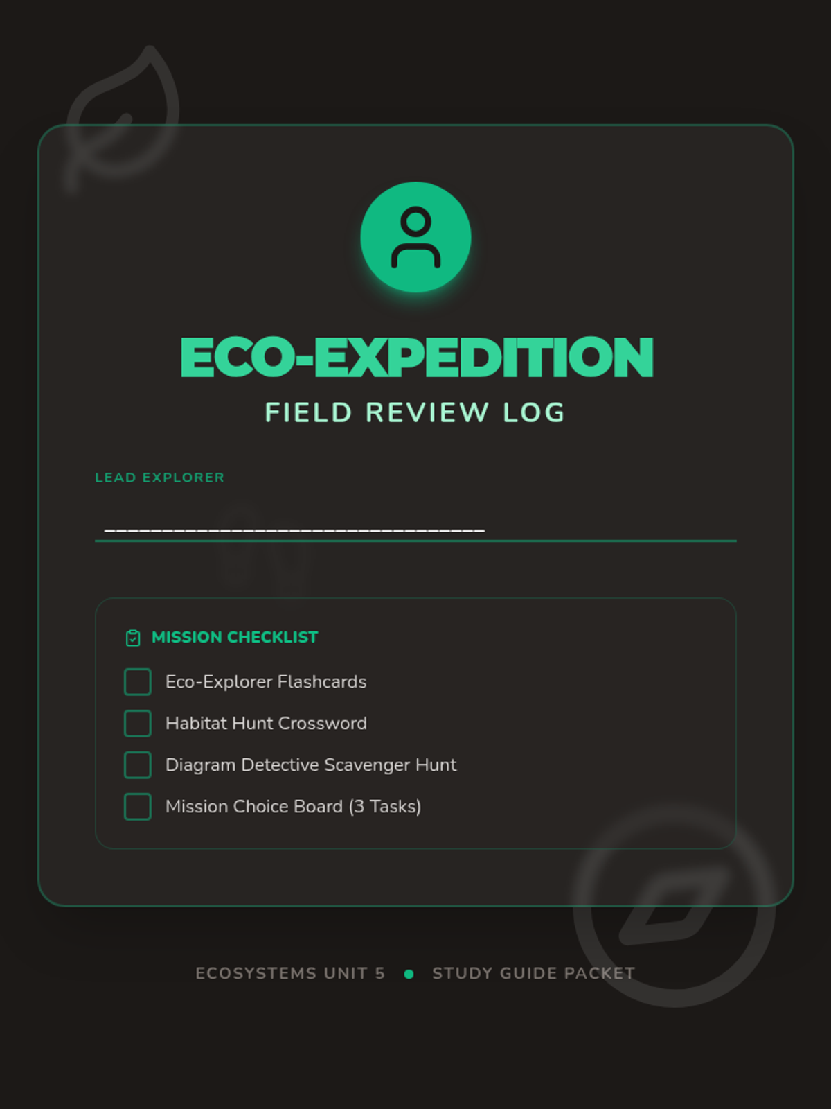 The individual cover page for the Eco-Expedition Review Packet. Includes space for a student's name, a thematic explorer design, and a checklist of the mission components to track individual progress.