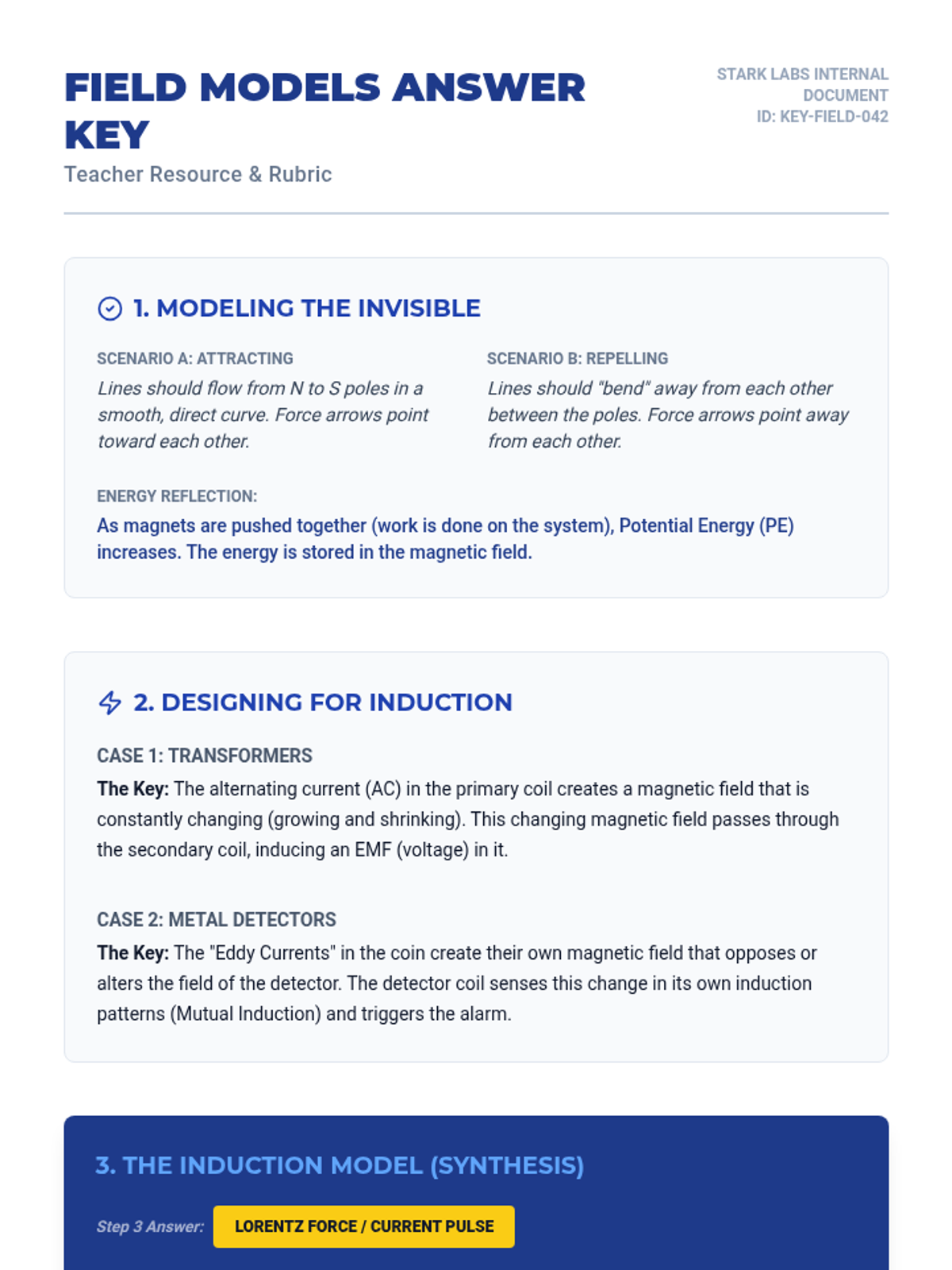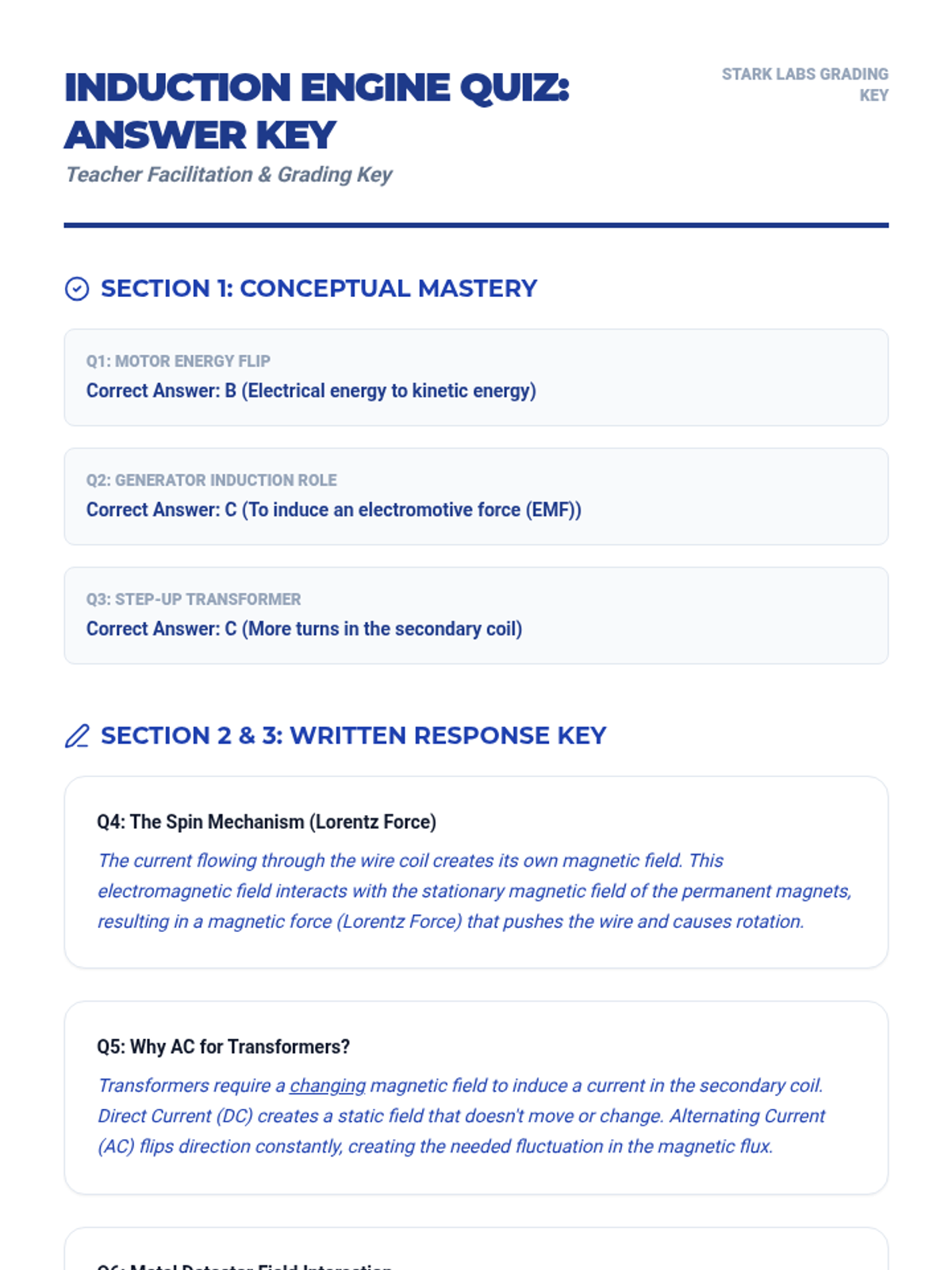 Teacher's answer key and grading guide for the Induction Engine Quiz, including point breakdowns and detailed scientific explanations.