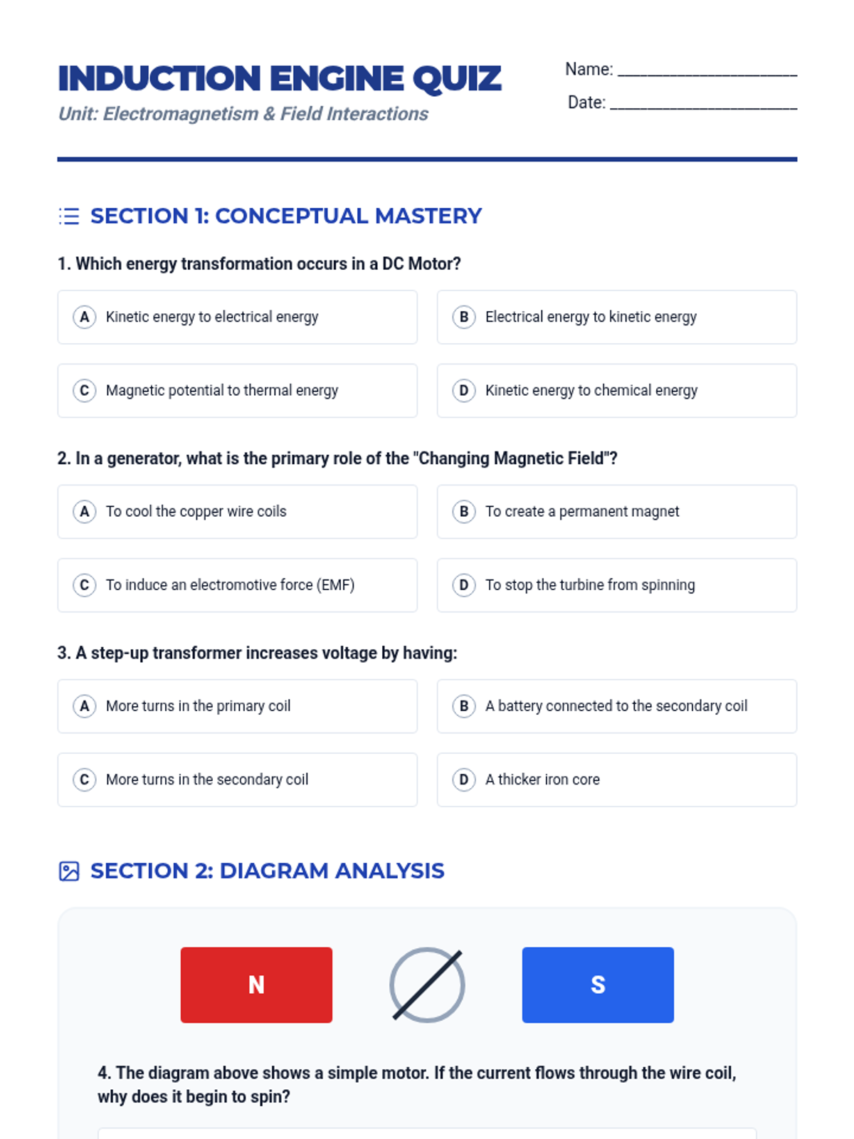A summative assessment for students to demonstrate mastery of electromagnetic induction, energy transformations in motors/generators, and transformer logic.
