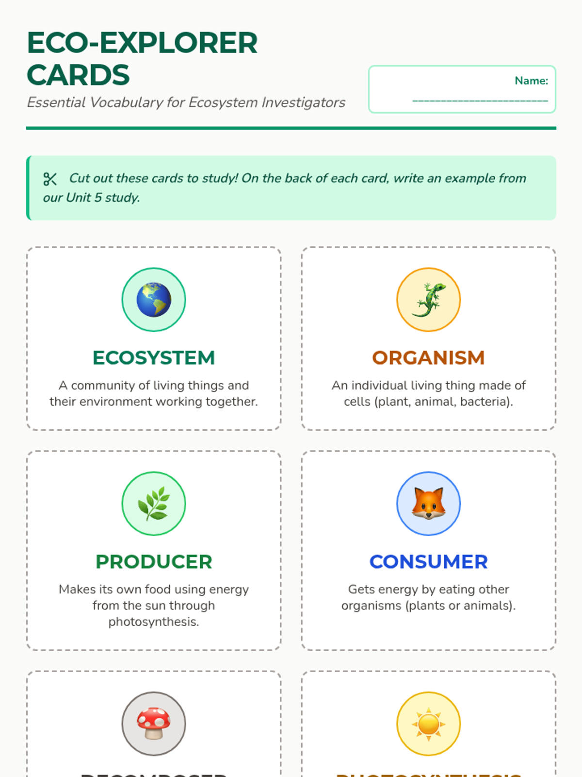 A set of 8 illustrated individual vocabulary cards featuring key ecosystem terms. Designed for independent study, each card includes a child-friendly definition and a thematic icon.