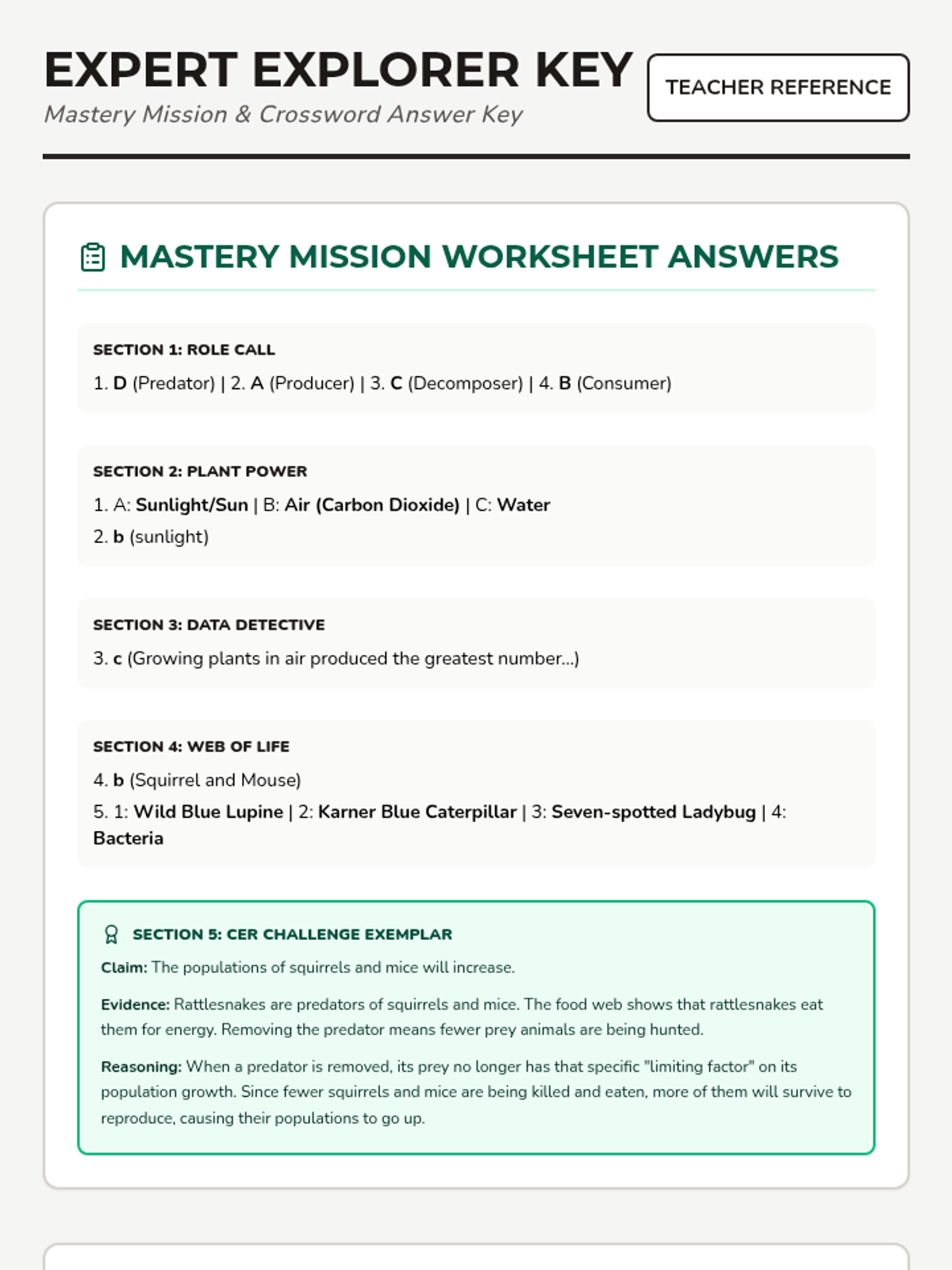 An updated teacher answer key covering the new Mastery Mission Worksheet and the Habitat Hunt Crossword. Includes specific correct responses for multiple choice, diagram labeling, model completion, and a full CER exemplar.