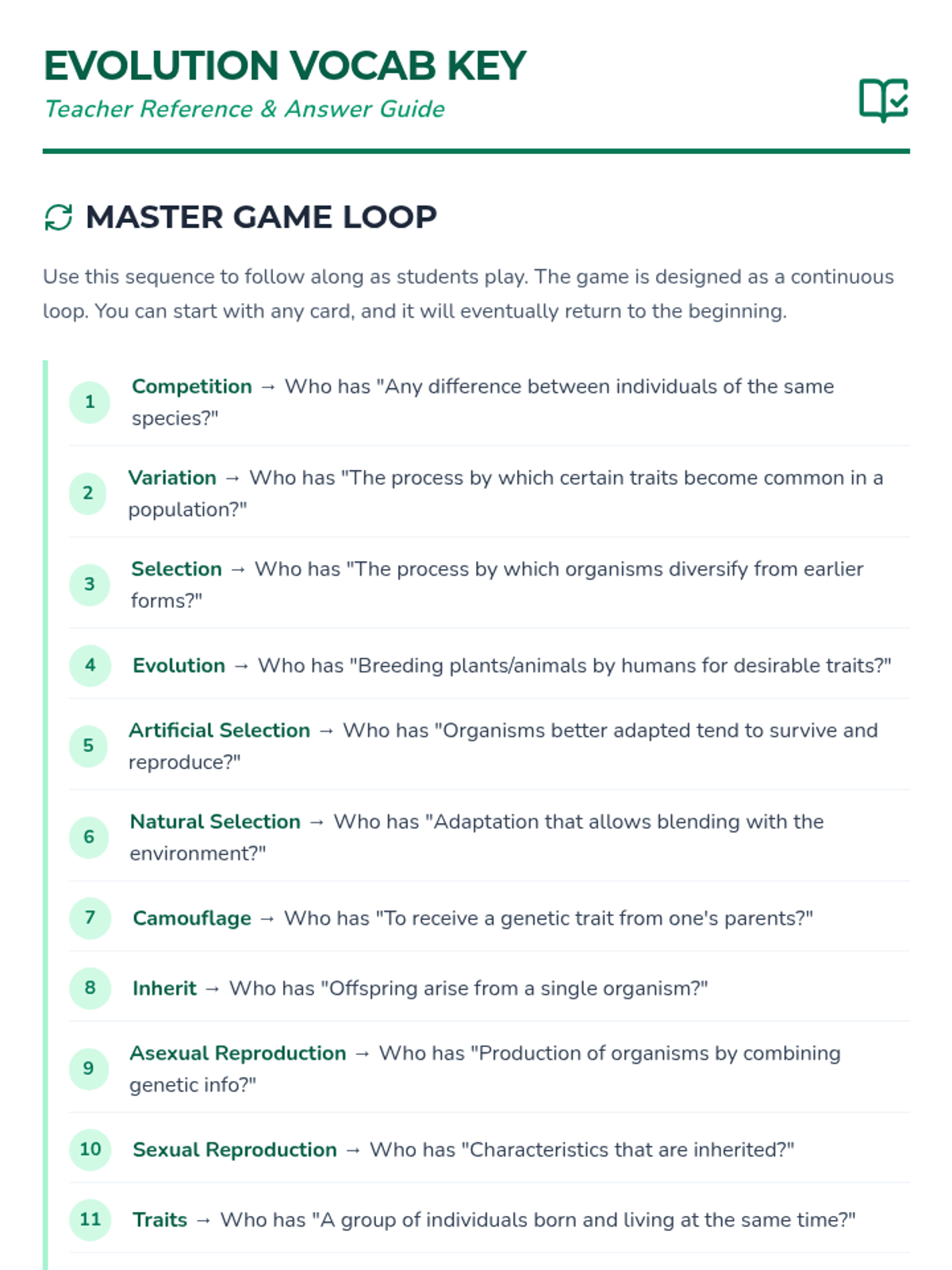 A teacher reference guide for the Evolution Echo Cards game, including the master loop sequence and a vocabulary definition list.