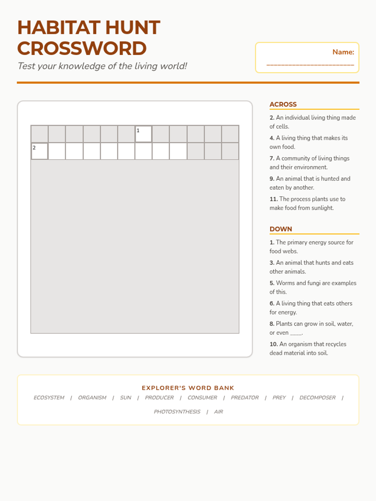 An individual ecosystem-themed crossword puzzle that reinforces vocabulary from the unit. Students use clues about food web roles, energy sources, and plant growth methods to fill in the grid.