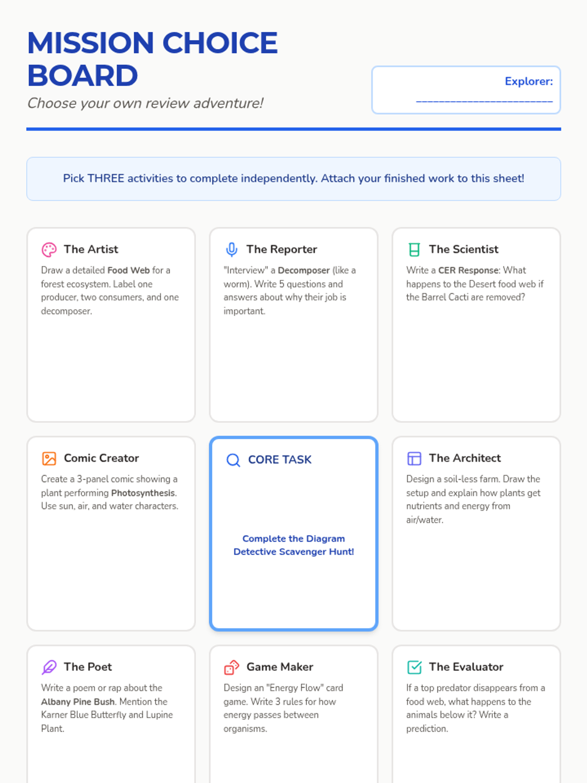 An individual choice board featuring 9 unique review activities. Students choose three tasks to complete independently to demonstrate their understanding of ecosystems.