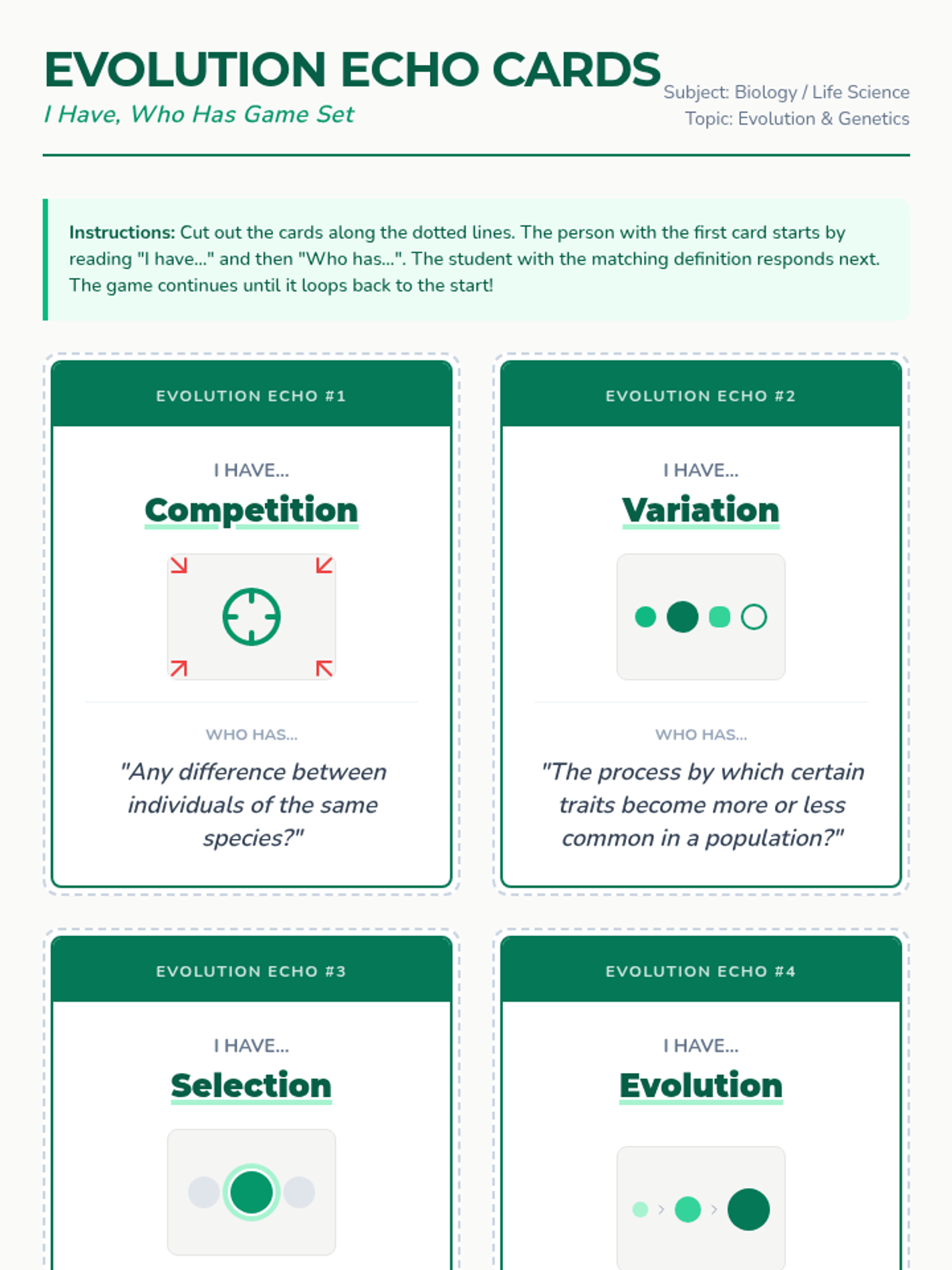 A complete set of 12 'I Have, Who Has' cards for evolution vocabulary, featuring illustrative diagrams and clear definitions to facilitate classroom-wide collaborative learning.