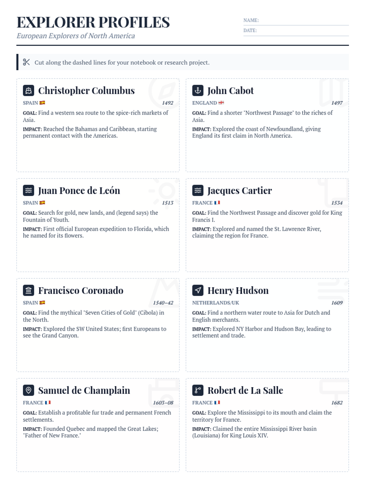A collection of 8 European explorer profile cards for North America, condensed onto a single printable page for cut-and-glue activities. Each card includes the explorer's name, sponsoring country, voyage date, and key discoveries.