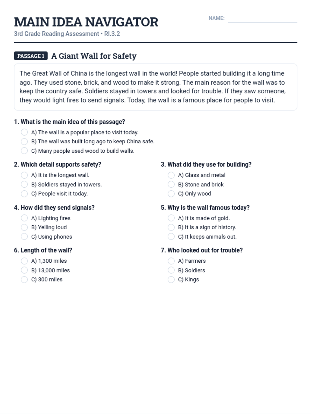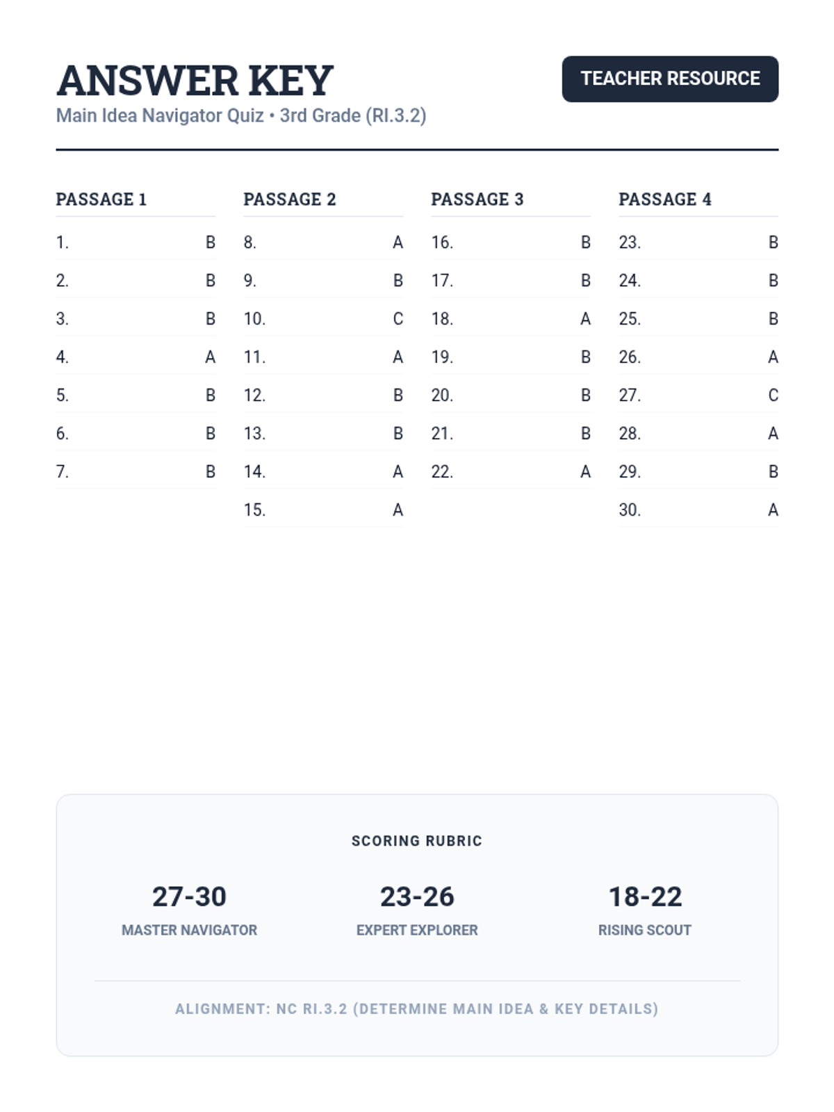 The complete answer key and scoring rubric for the 30-question Main Idea Navigator Quiz.