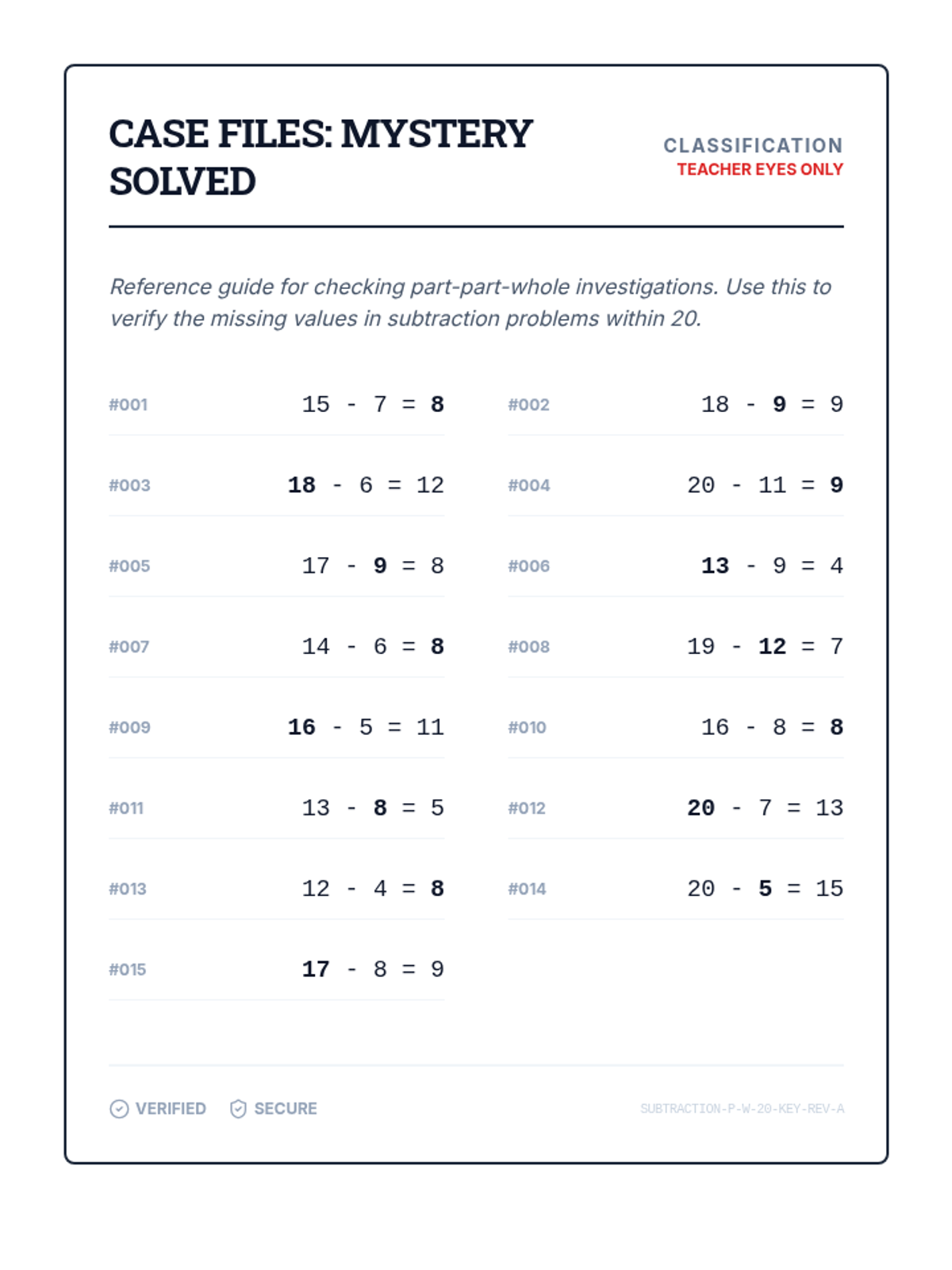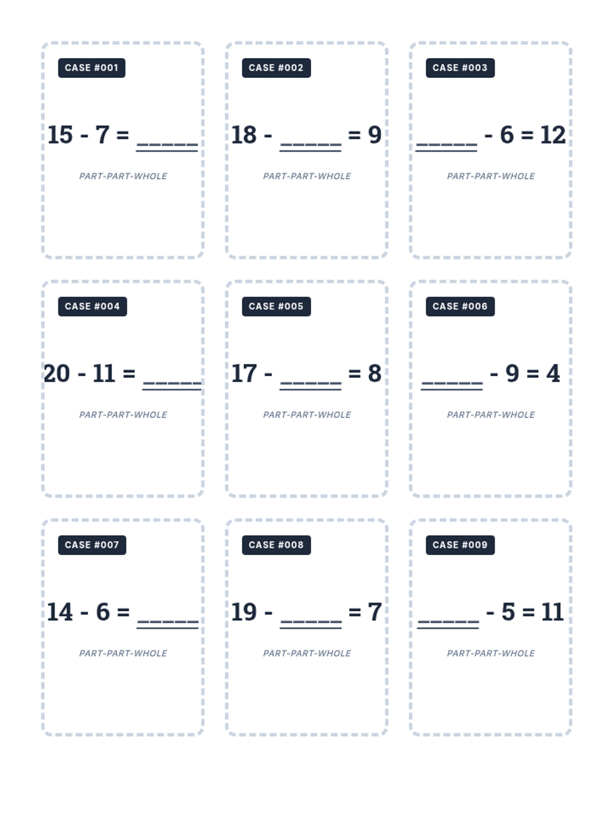 A complete set of 15 double-sided printable subtraction flashcards focusing on part-part-whole relationships within 20. Problems appear on the front, and bold solutions on the back are aligned for simple double-sided printing.