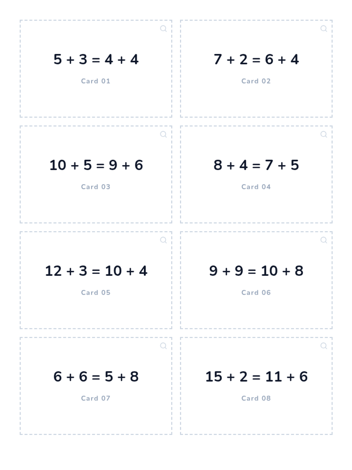 A set of 15 printable flashcards featuring balanced equations with addition and subtraction within 20. The layout includes mirrored answer backs for double-sided printing.