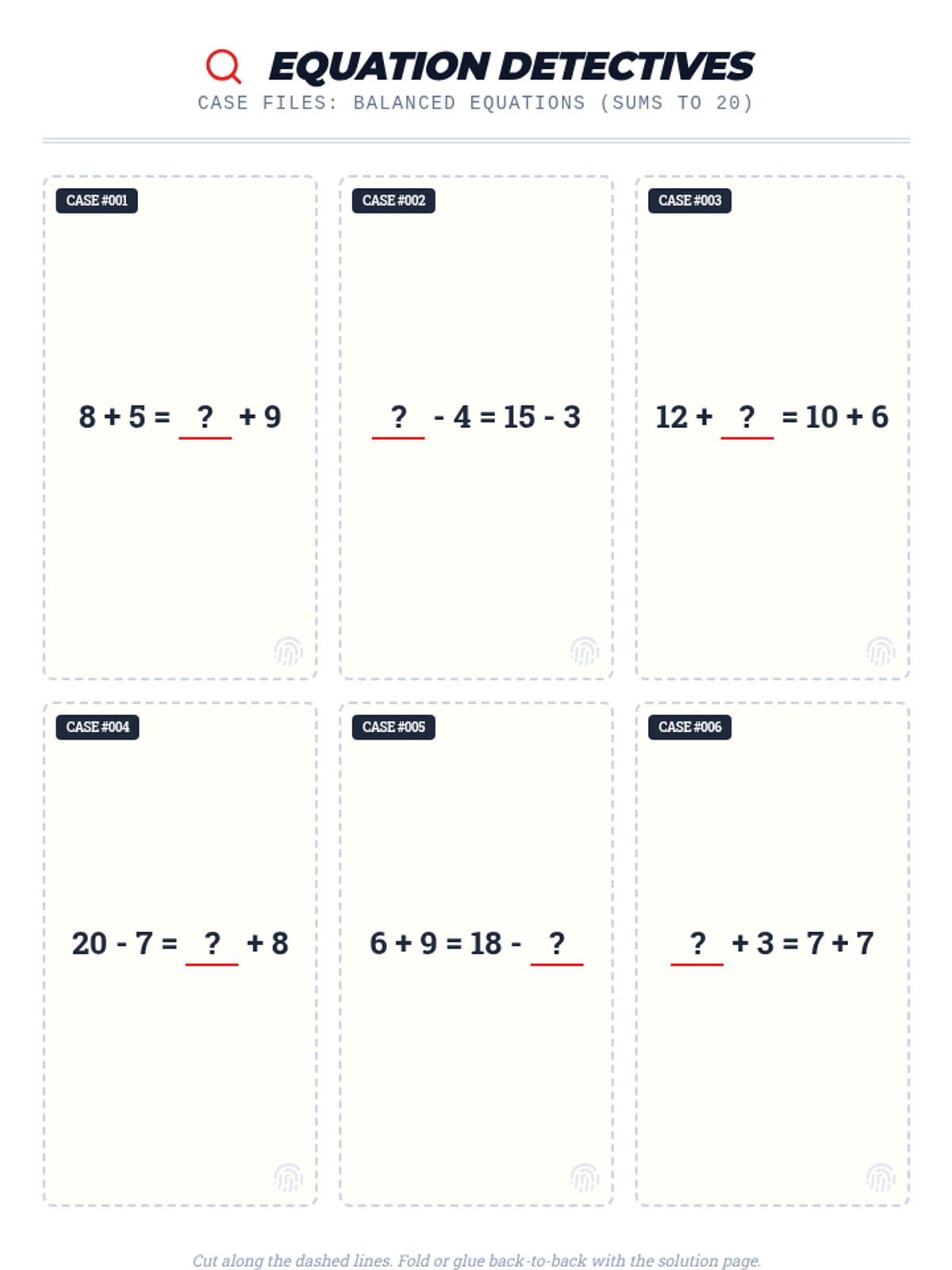 A set of 15 "Equation Detective" themed flashcards featuring balanced equations with sums and differences up to 20. Designed for double-sided printing with questions on the front and mirrored answers on the back for perfect alignment.