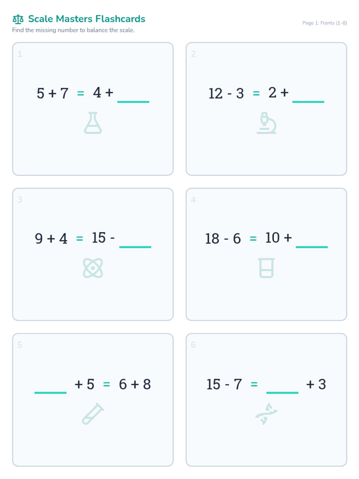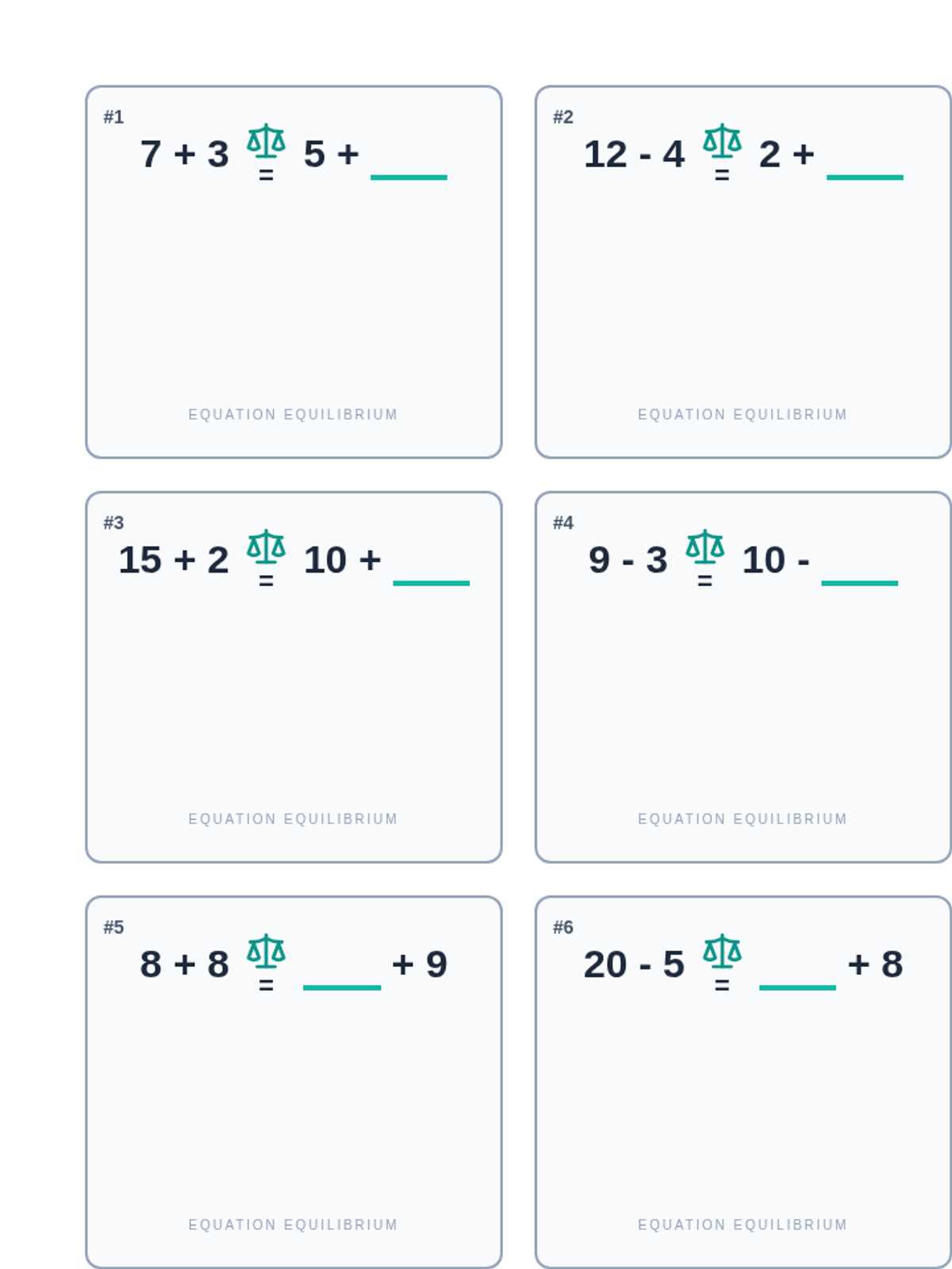 A set of 15 double-sided math flashcards focusing on balanced equations within 20. Each card features an addition or subtraction problem on both sides of a scale, with one part missing for the student to solve. Designs are mirrored for perfect double-sided printing.