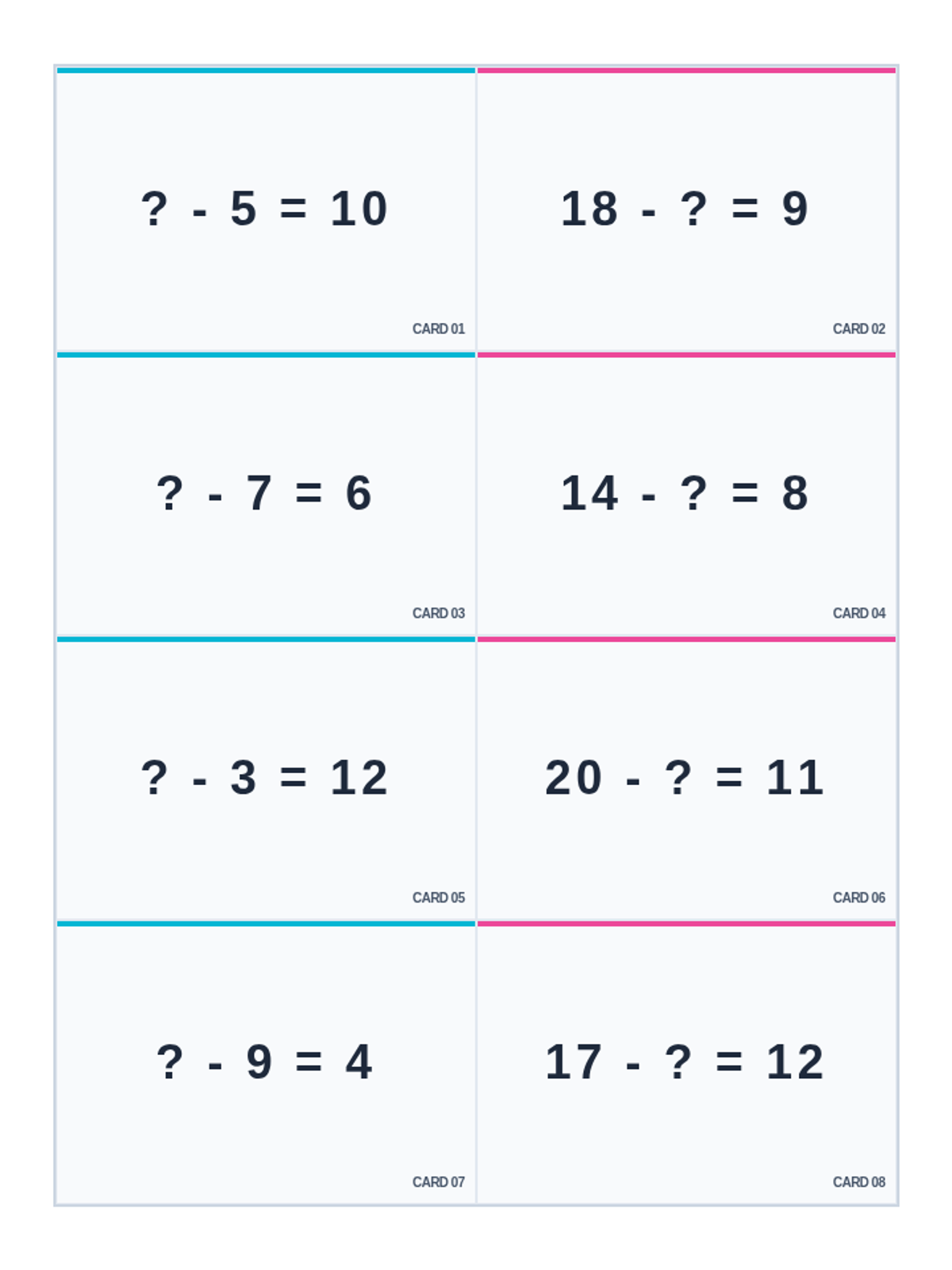 A set of 15 printable flashcards for subtraction within 20, featuring both missing part and missing whole equations. Designed for double-sided printing with mirrored answer layouts and corrected page breaks.