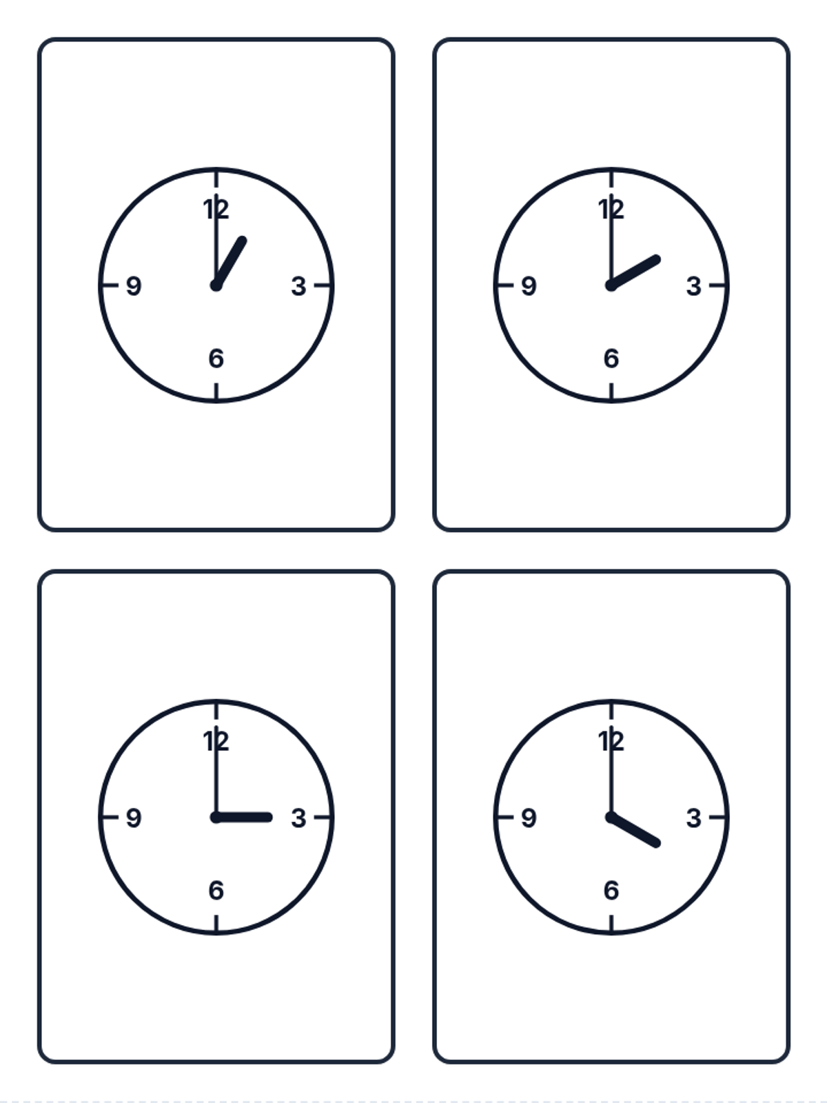 A set of 15 minimalist flashcards for telling time to the nearest hour. Each card features a clear analog clock face on the front and the corresponding digital time on the back, optimized for double-sided printing and cutting. Corrected hand lengths and alignment for accuracy.