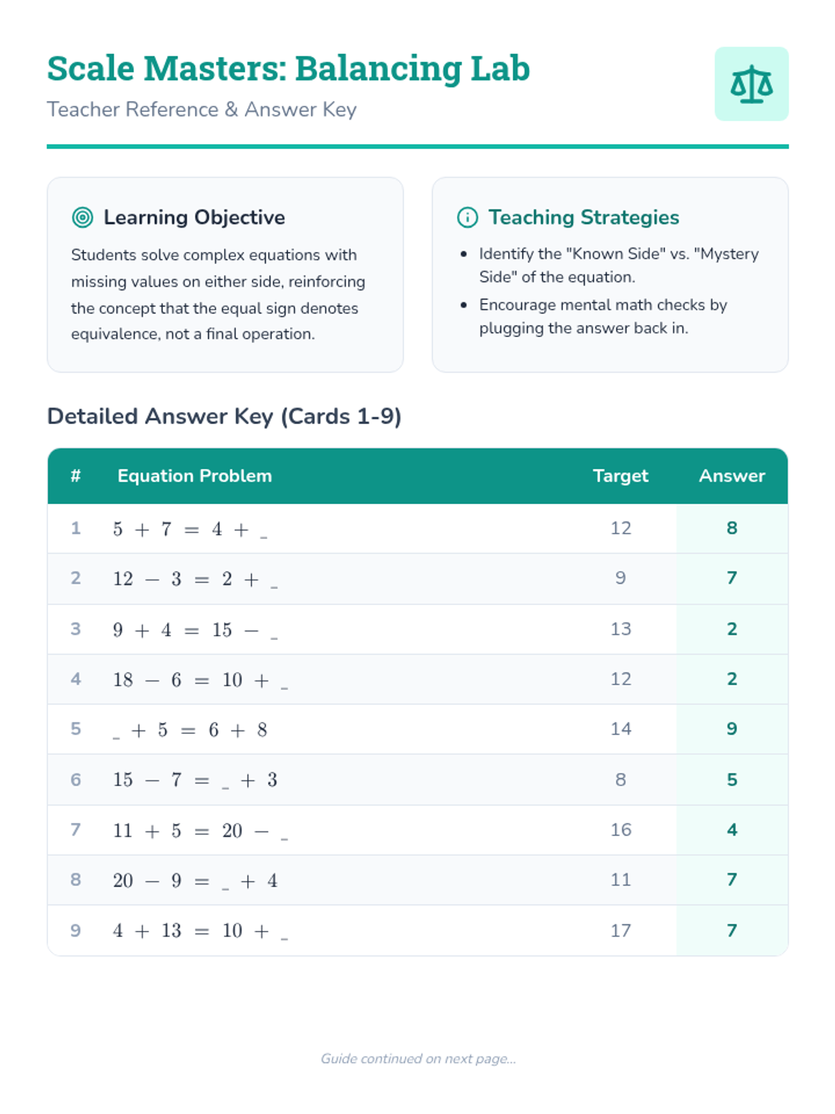 A teacher's guide and comprehensive answer key for the Scale Masters equation balancing flashcards, including target values and teaching tips.