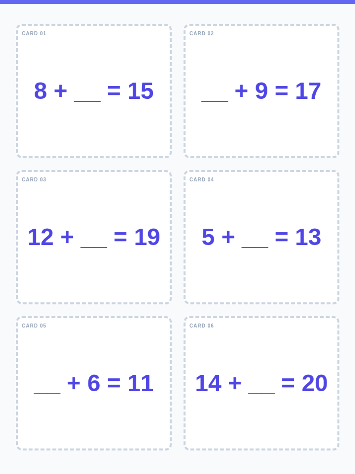 A set of 15 double-sided flashcards featuring missing addend equations with sums up to 20. The cards are formatted for easy printing and cutting, with 6 cards per page and mirrored answer keys for double-sided use.