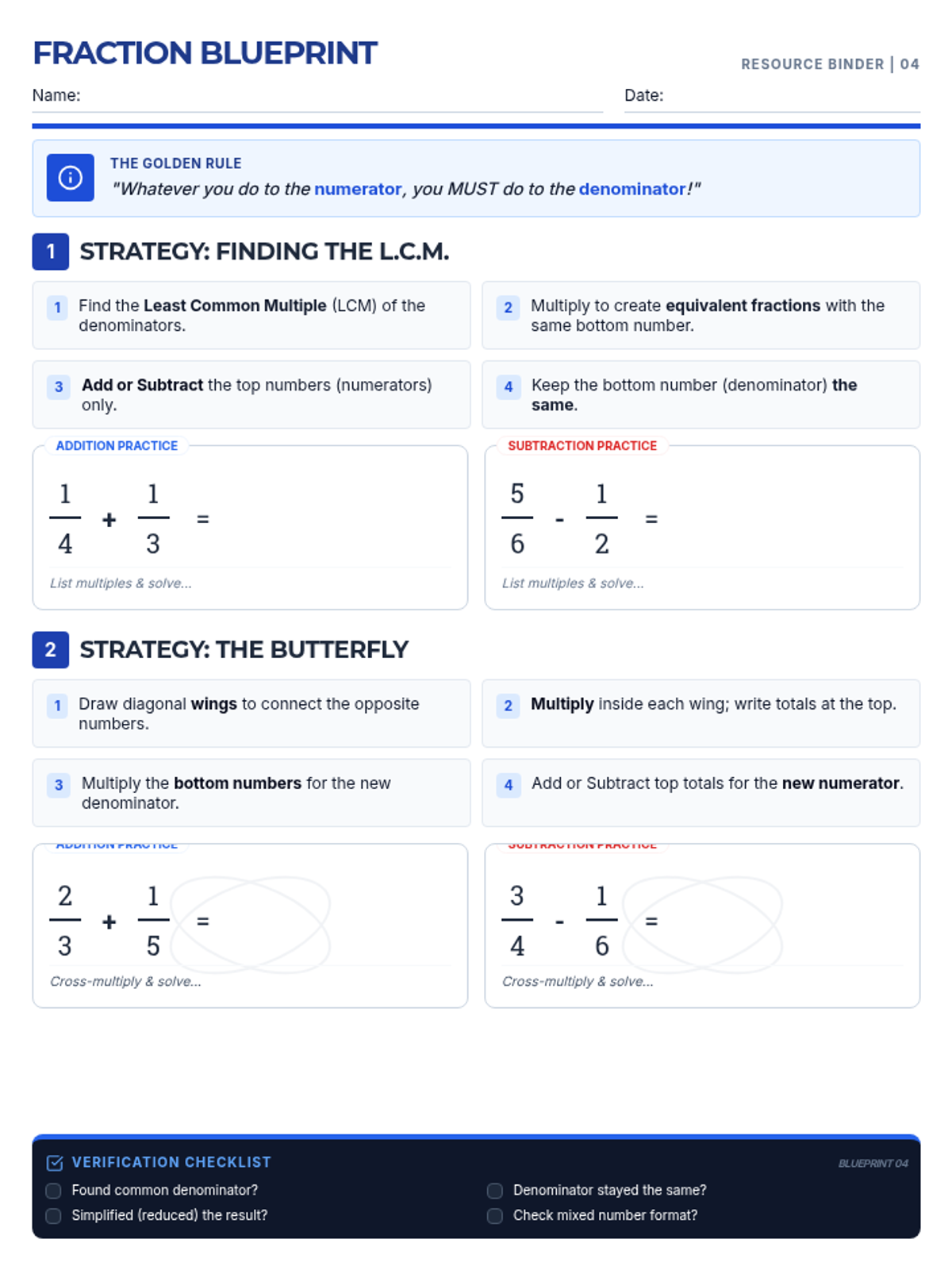 A redesigned math anchor chart for adding and subtracting fractions. It provides explicit step-by-step instructions for both the LCM and Butterfly methods, with dedicated work areas for addition and subtraction problems integrated directly beneath each strategy.