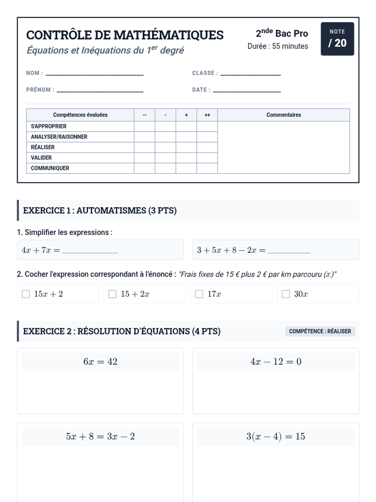 A standard 9th-grade math assessment focusing on exponents, percentages, and financial word problems. Designed with a clean blueprint theme suitable for formal testing.