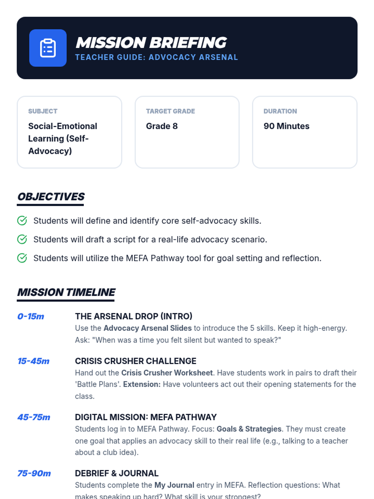 A comprehensive facilitation guide for teachers to deliver the Advocacy Arsenal lesson. Includes pacing, discussion prompts, tips for handling common misconceptions, and instructions for the digital component.